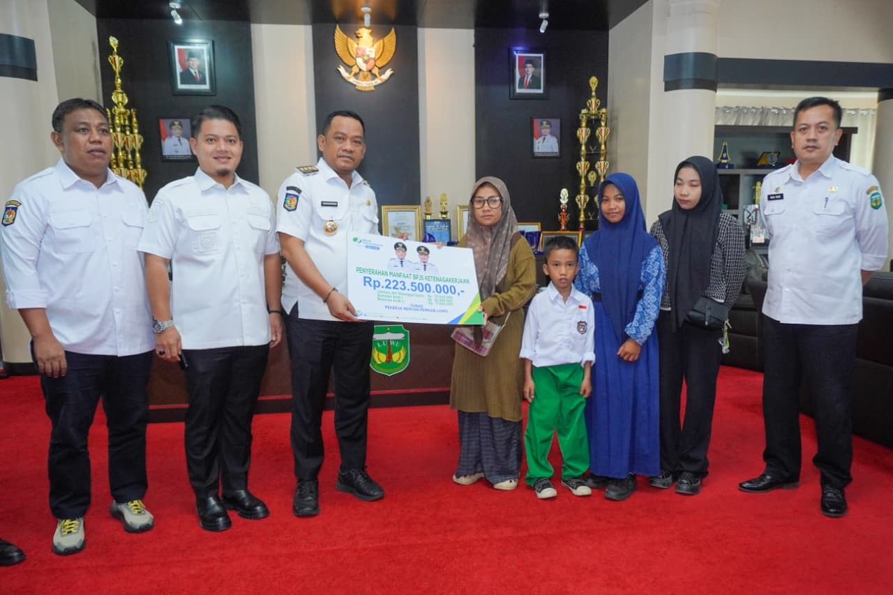 Bupati Luwu, Patahudding, menyerahkan santunan kecelakaan kerja kepada keluarga almarhum Yunus di ruang kerja Bupati Luwu, Rabu (22/4/2026). Total santunan yang diberikan mencapai Rp223.500.000 yang terdiri dari santunan kematian serta beasiswa bagi anak almarhum. Yunus…