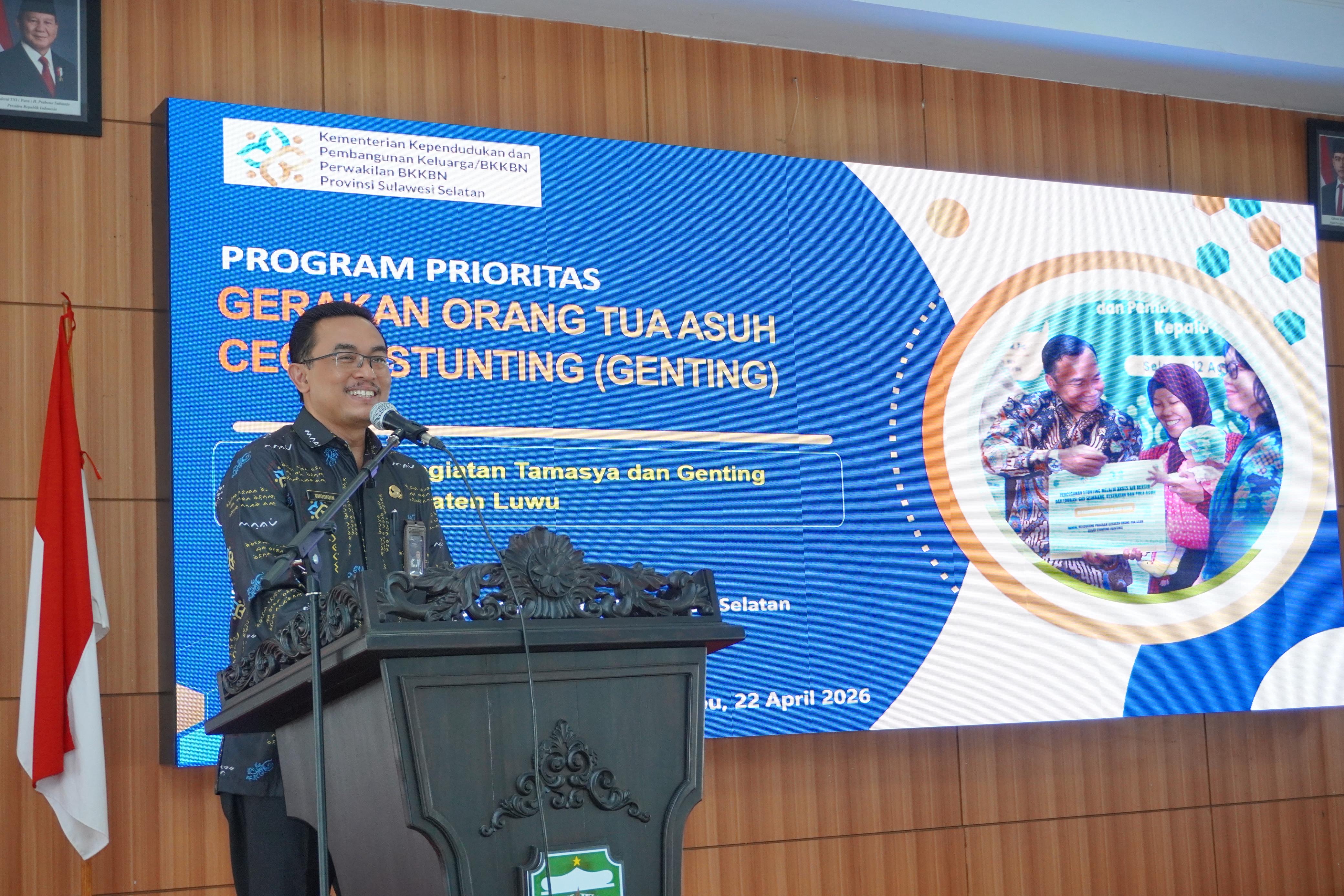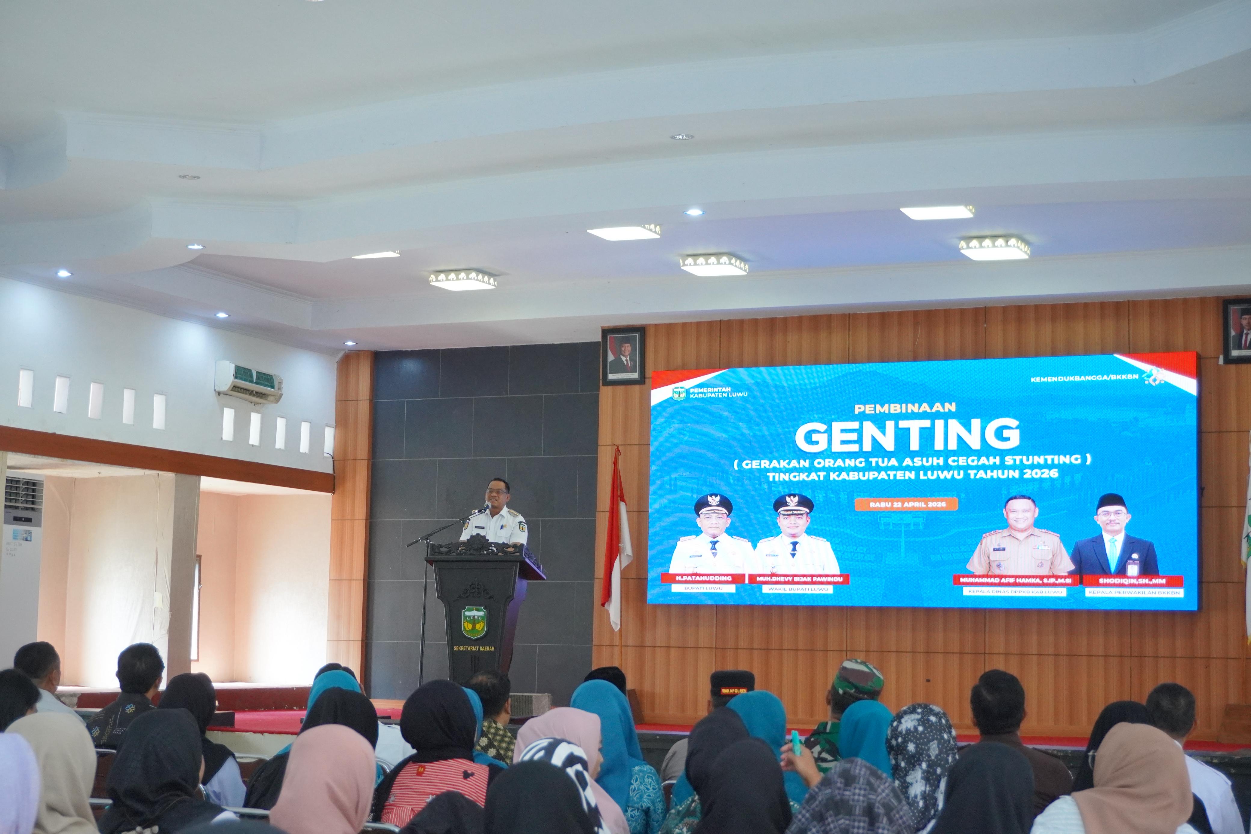 Bupati Luwu, Patahudding, membuka kegiatan Pembinaan Gerakan Orang Tua Asuh Cegah Stunting (GENTING) di Ruang Pola Andi Kambo, Rabu (22/4/2026).