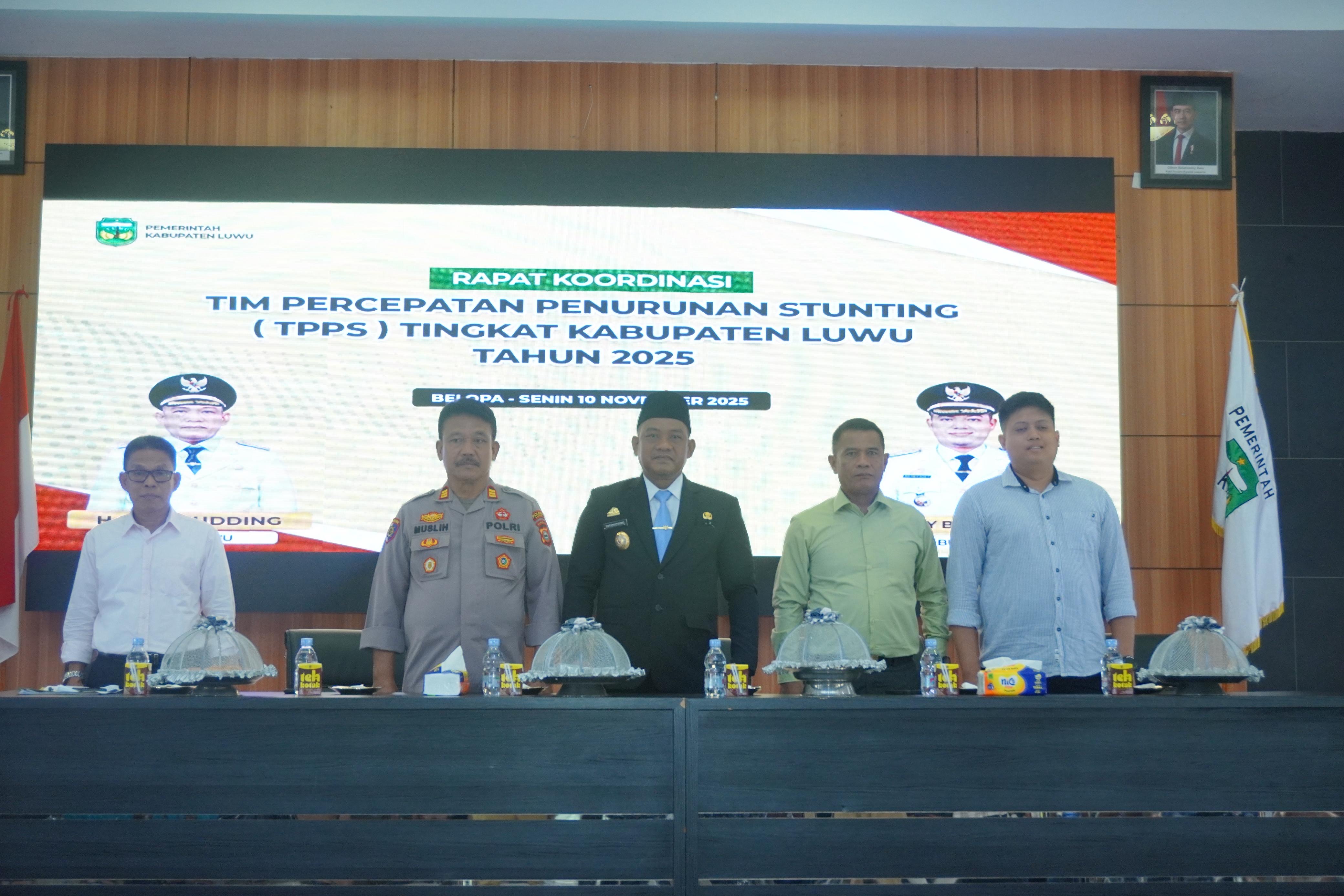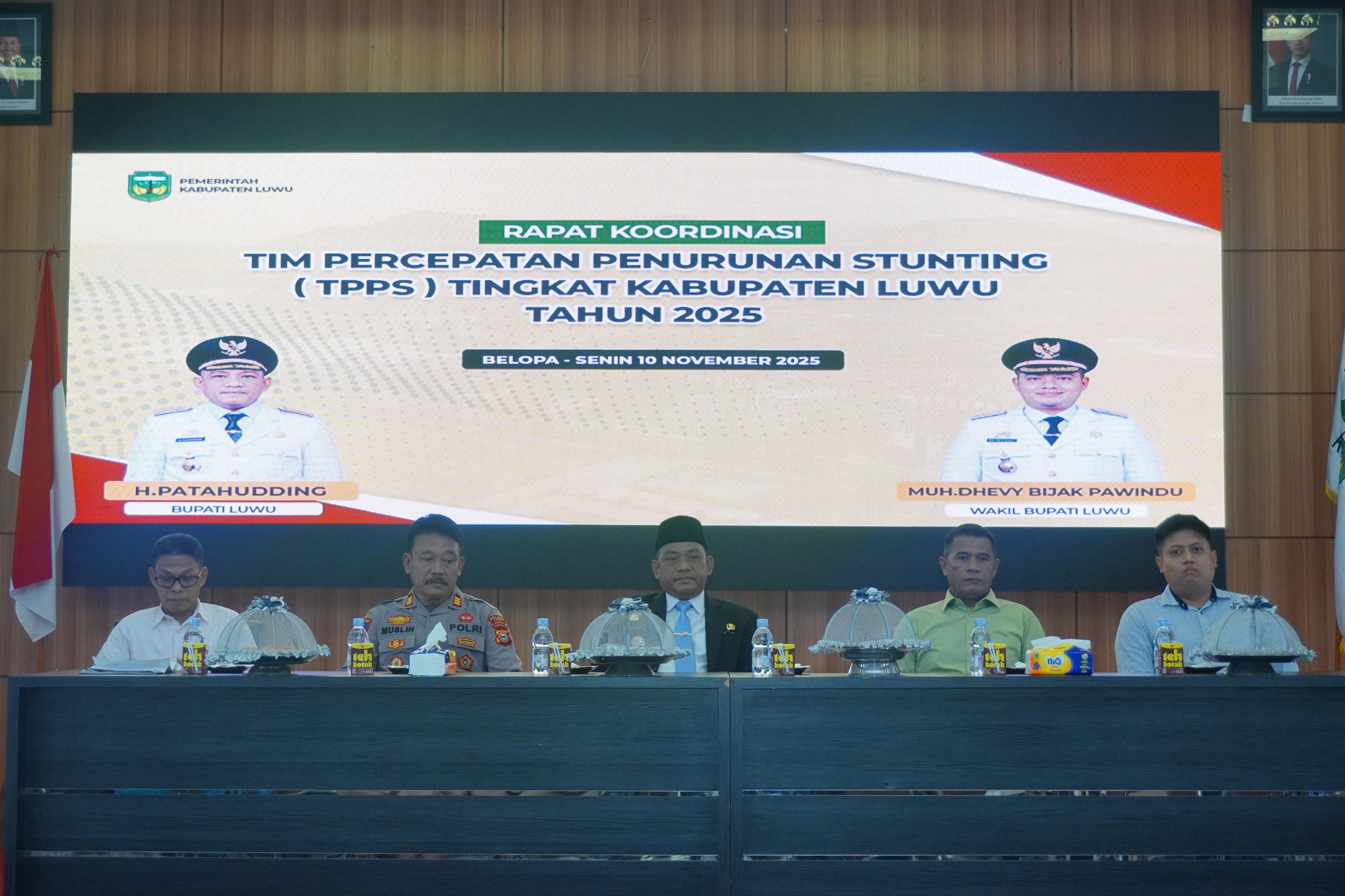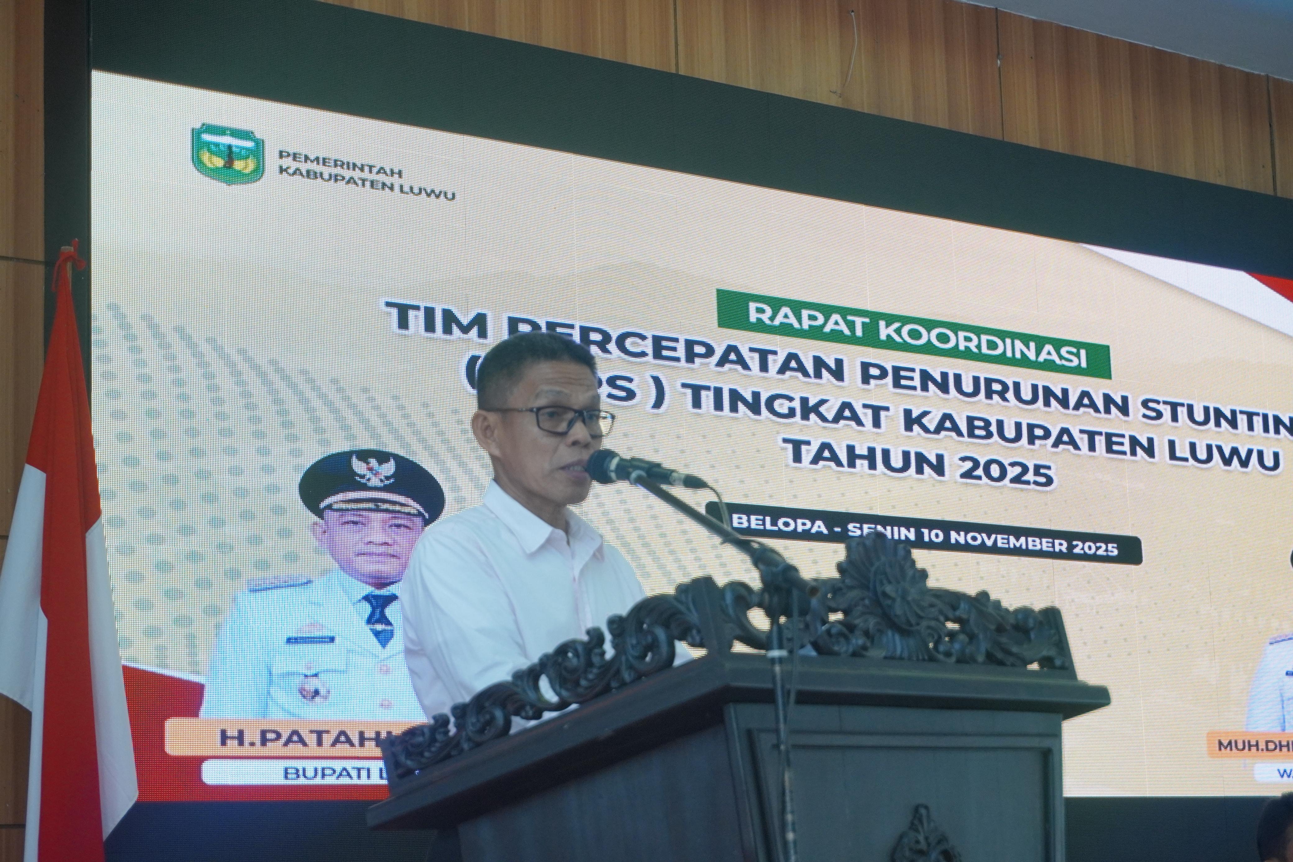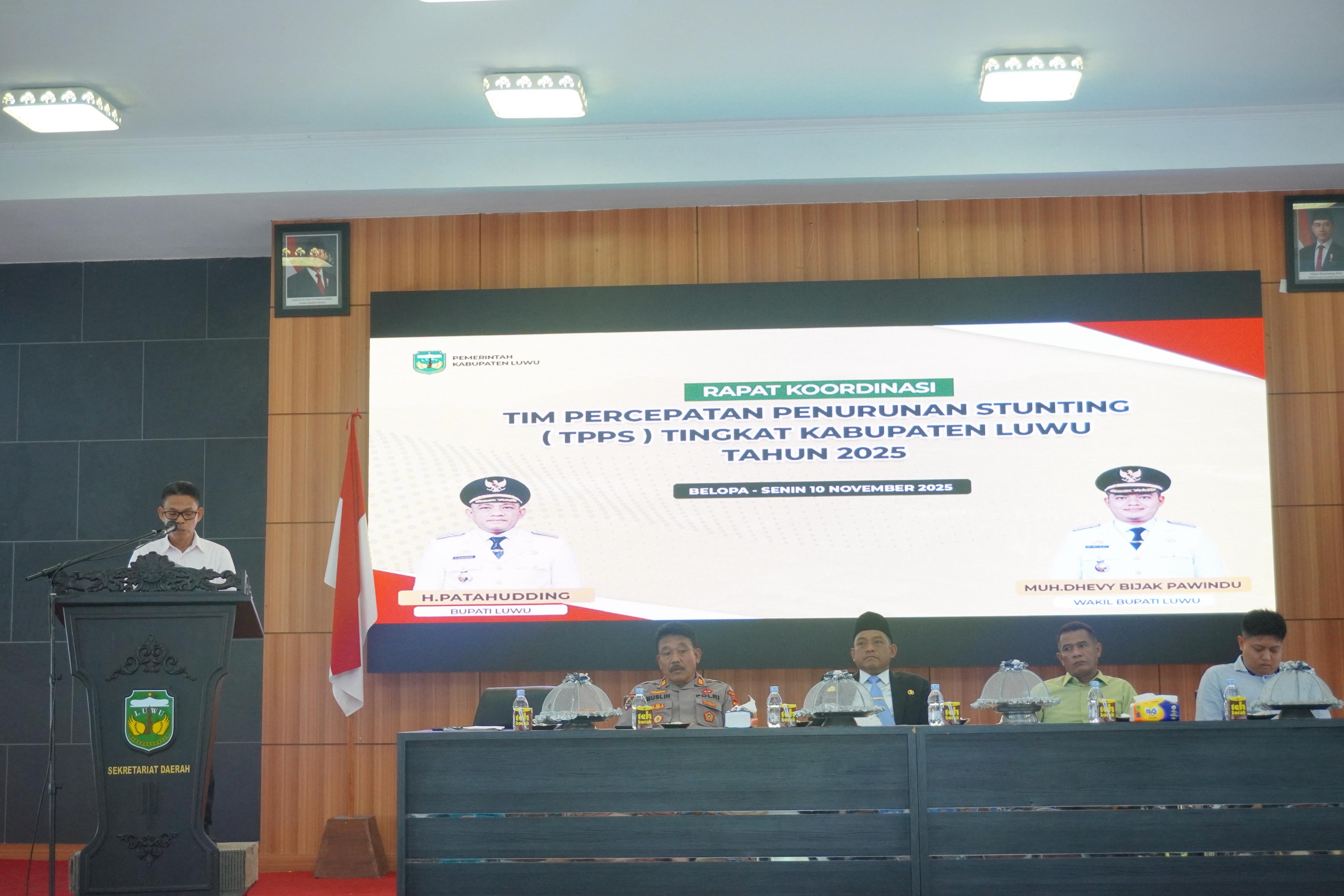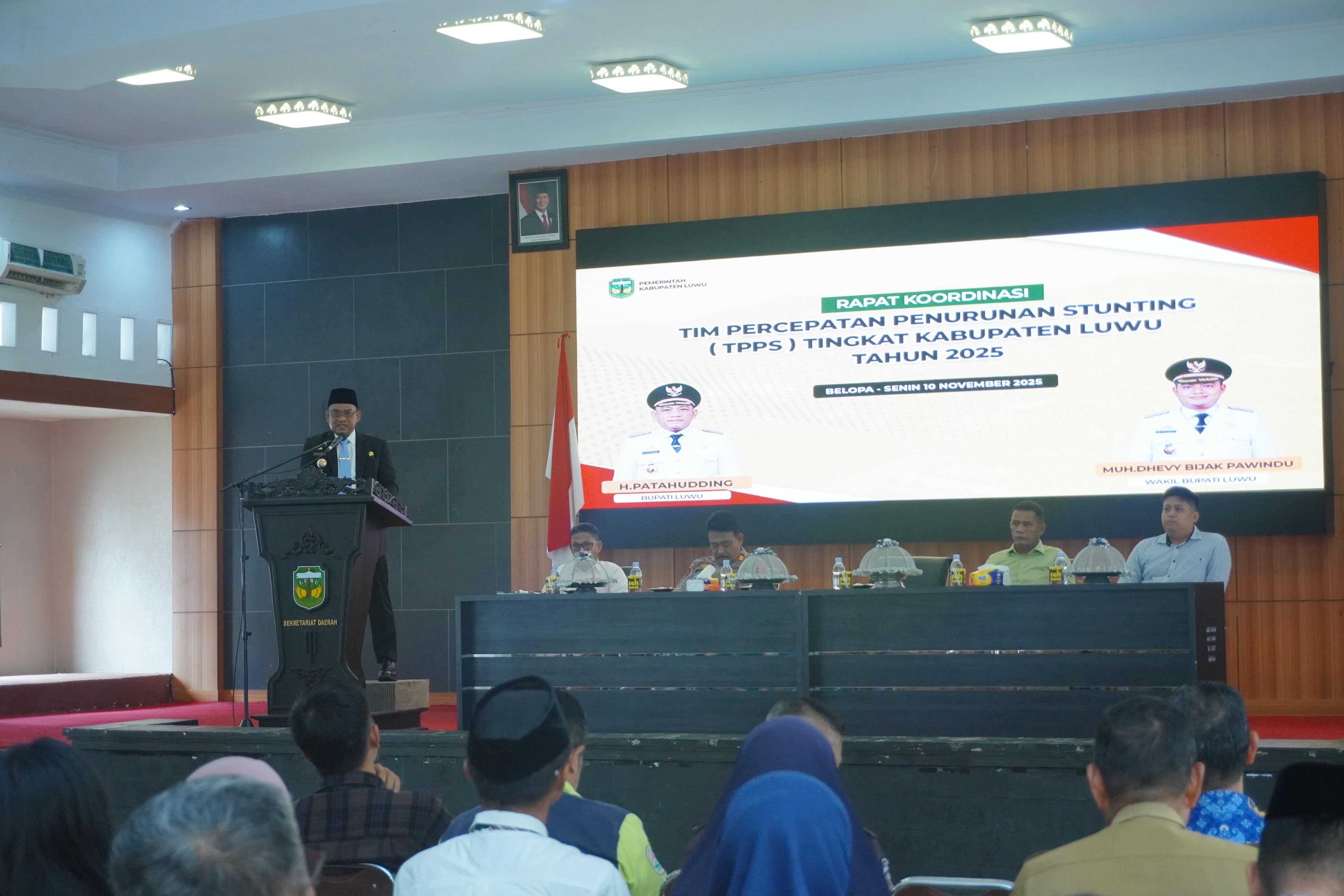 Bupati Luwu, Patahudding, membuka secara resmi Rapat Koordinasi Tim Percepatan Penurunan Stunting (TPPS) Tingkat Kabupaten Luwu Tahun 2025 yang berlangsung di Ruang Pola Kantor Bupati Luwu, Belopa, Senin (10/11/2025).