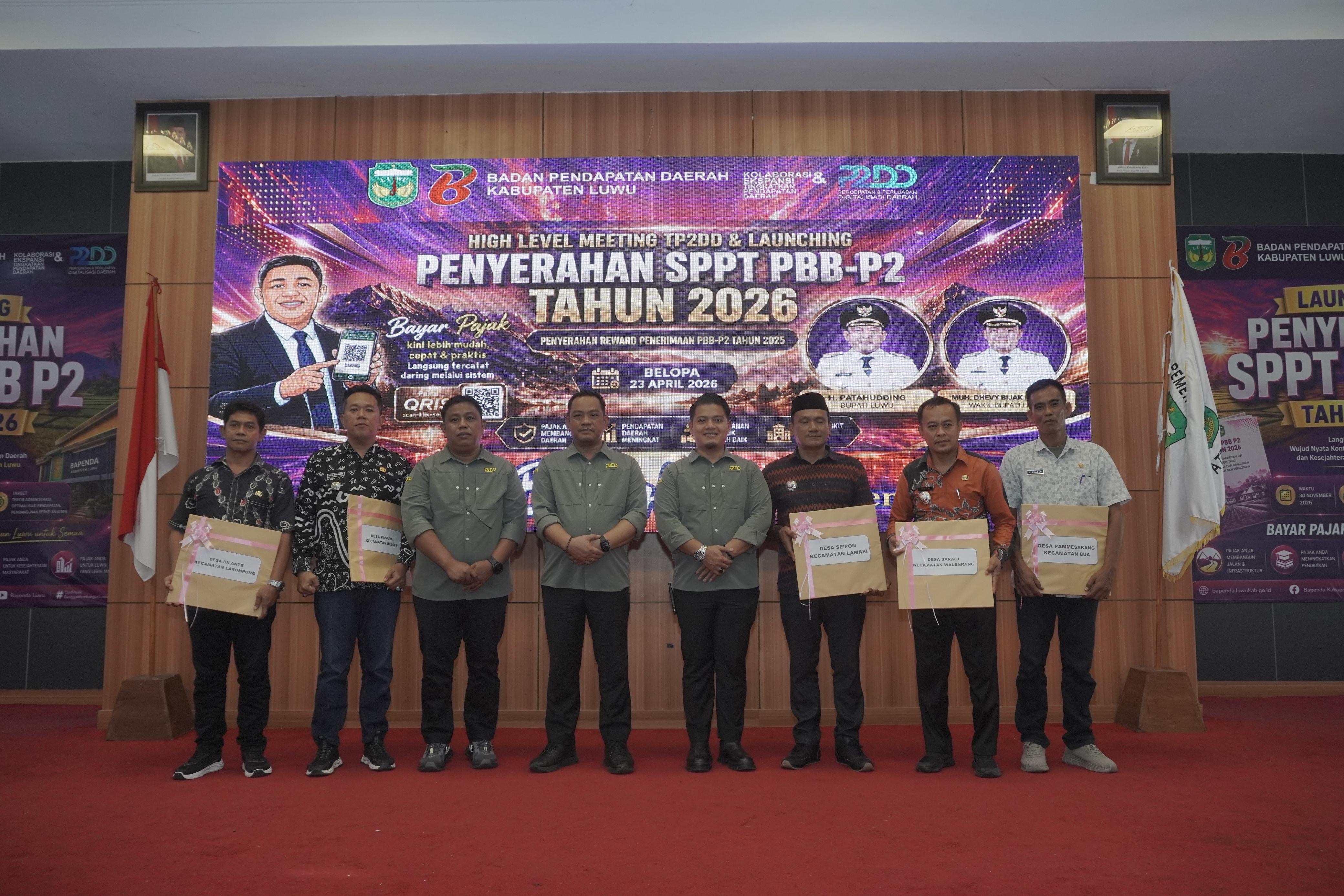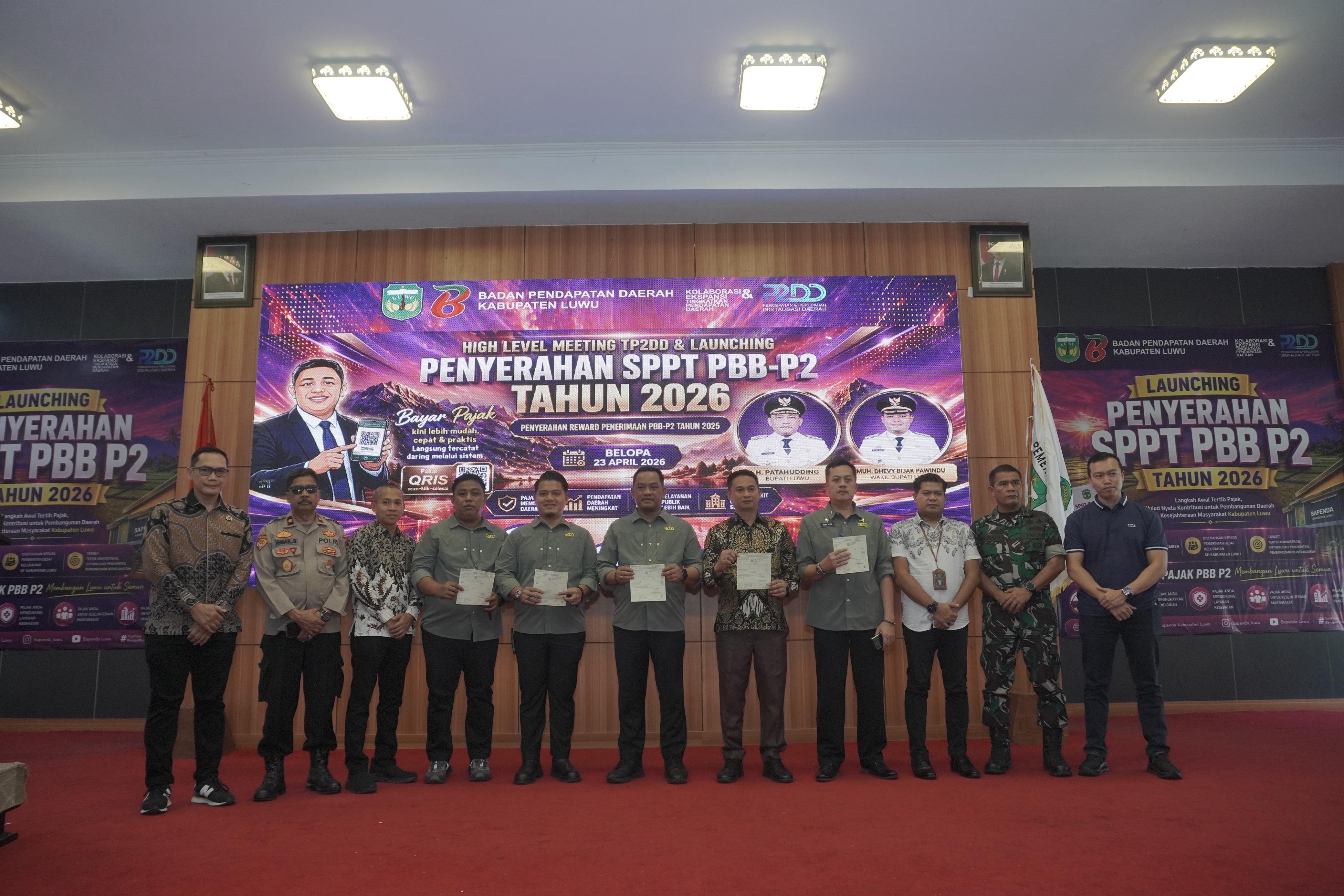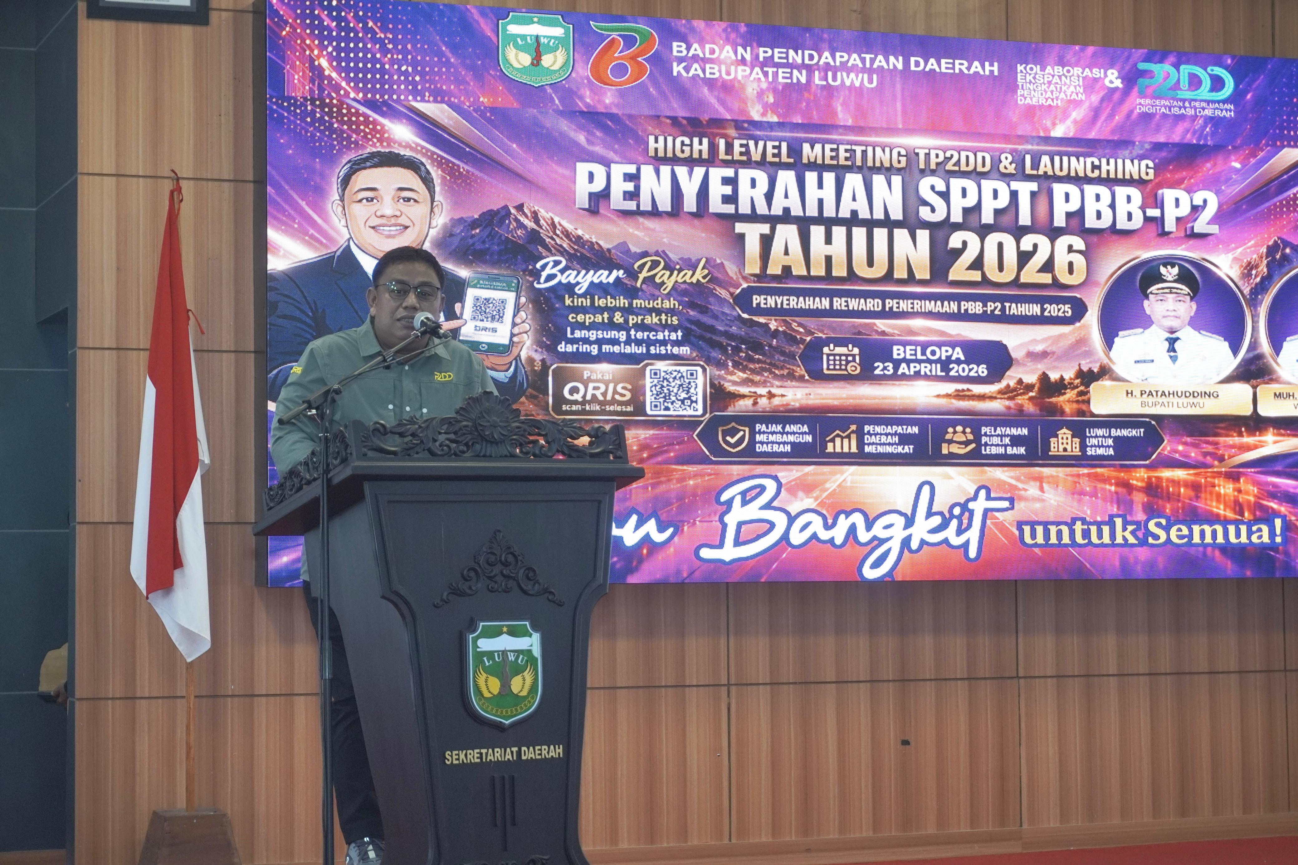 Bupati Luwu, Patahuddin menghadiri High Level Meeting Tim Percepatan dan Perluasan Digitalisasi Daerah (TP2DD) yang dirangkaikan dengan launching penyerahan SPPT PBB-P2 Tahun 2026 serta penyerahan reward penerimaan PBB-P2, Kamis (23/4/2026), di Aula Andi Kambo, Kompleks Perkantoran Bupati Luwu.