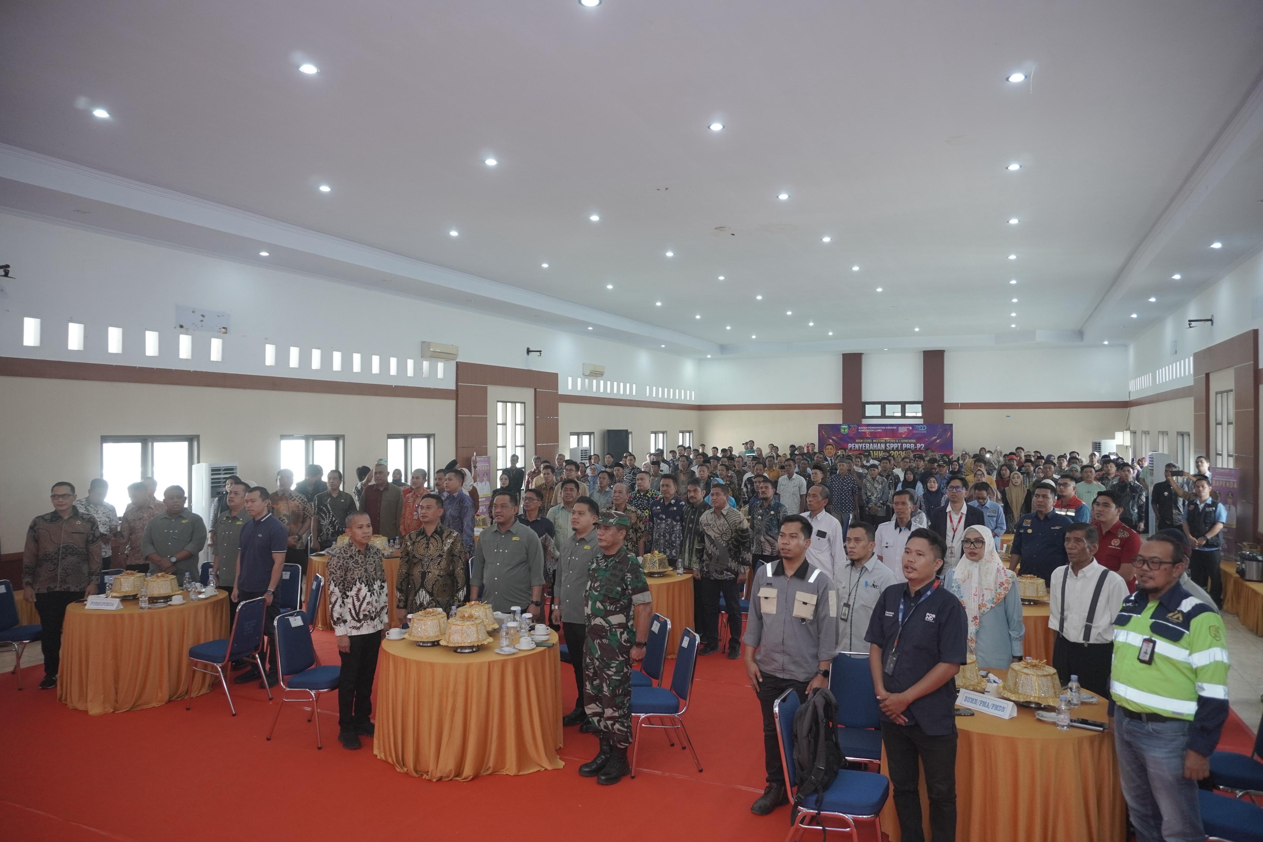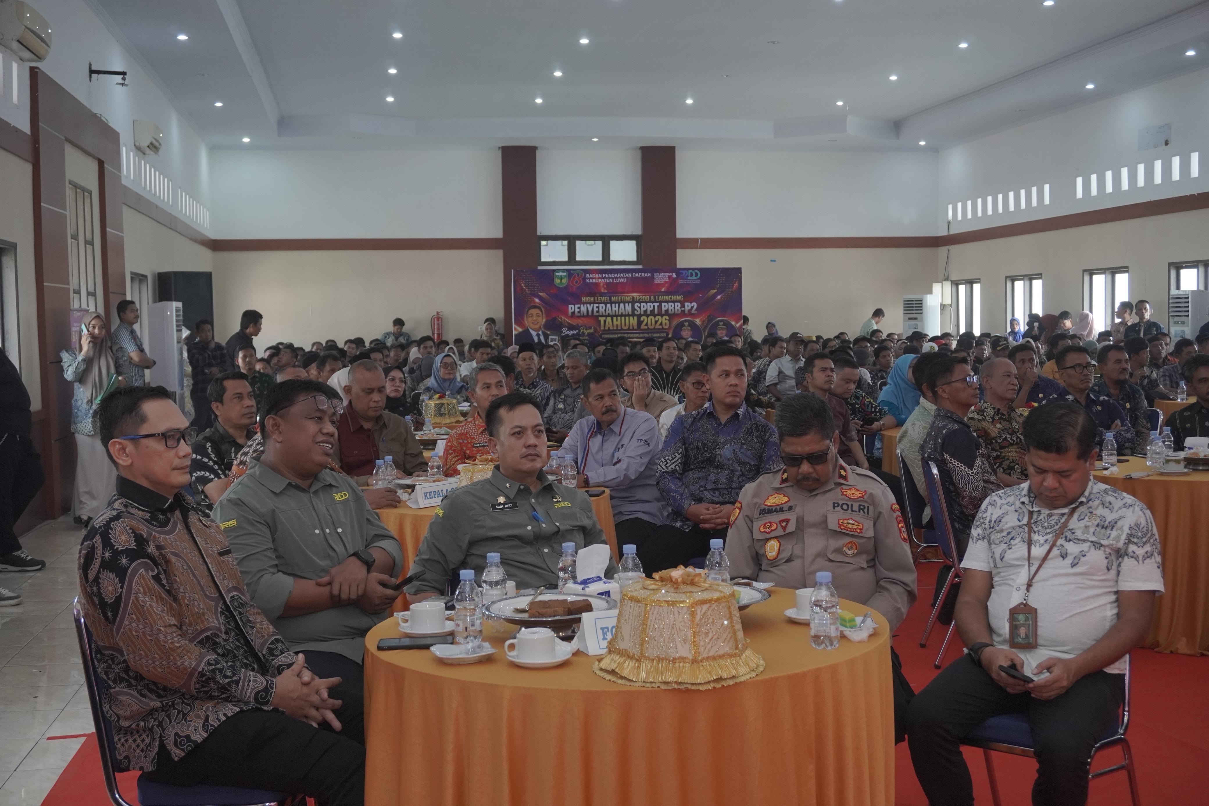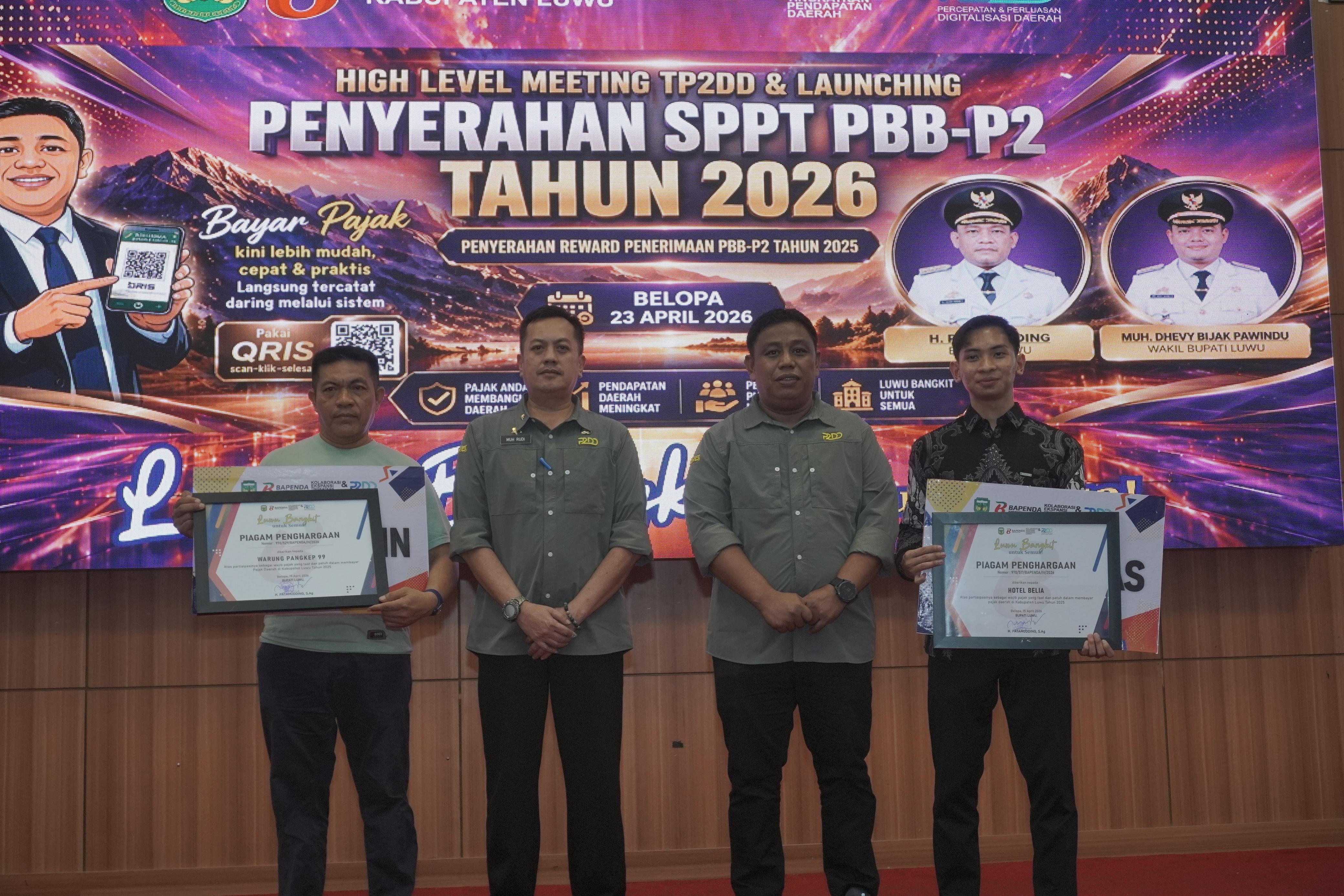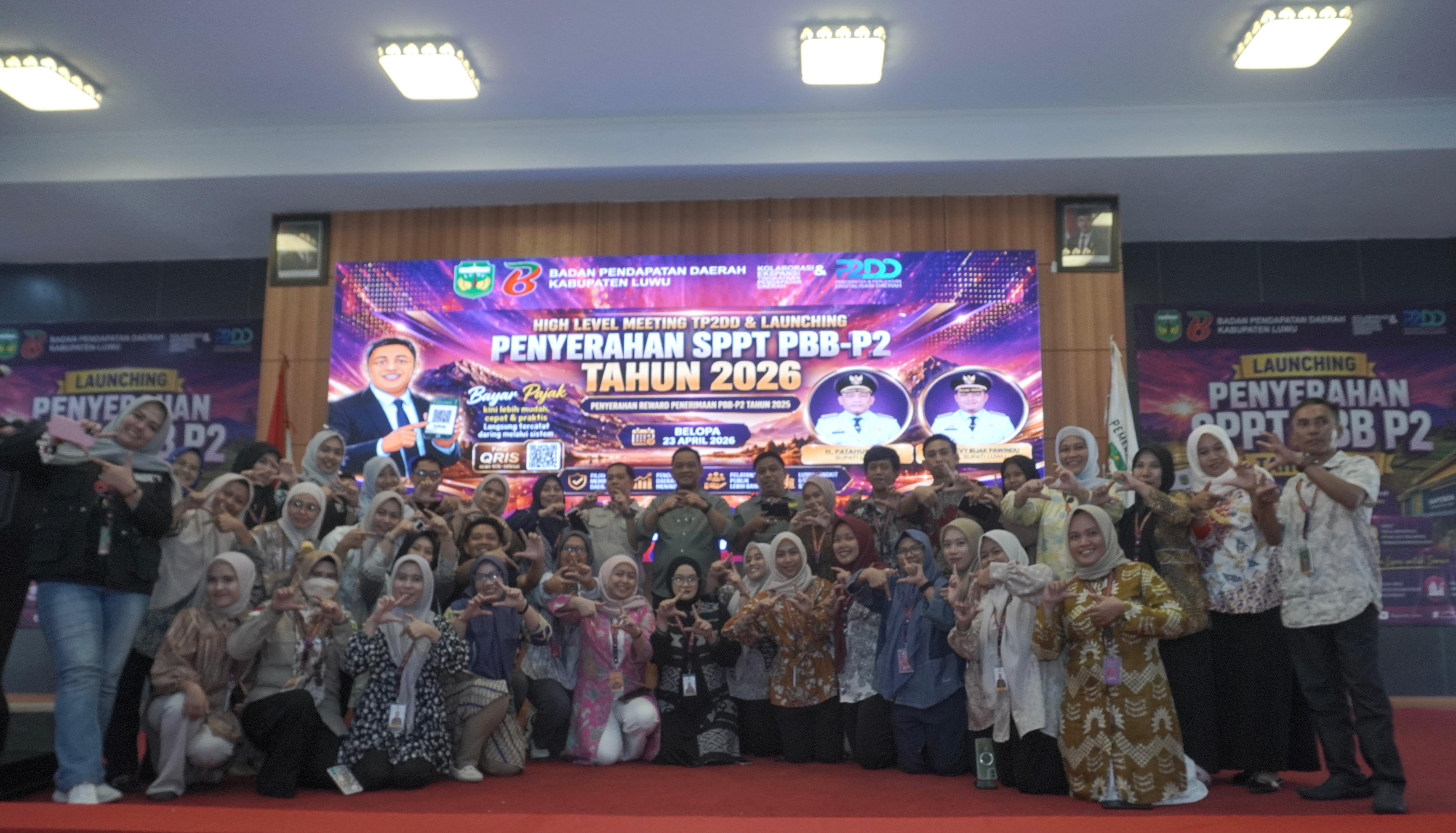 Bupati Luwu, Patahuddin menghadiri High Level Meeting Tim Percepatan dan Perluasan Digitalisasi Daerah (TP2DD) yang dirangkaikan dengan launching penyerahan SPPT PBB-P2 Tahun 2026 serta penyerahan reward penerimaan PBB-P2, Kamis (23/4/2026), di Aula Andi Kambo, Kompleks Perkantoran Bupati Luwu.