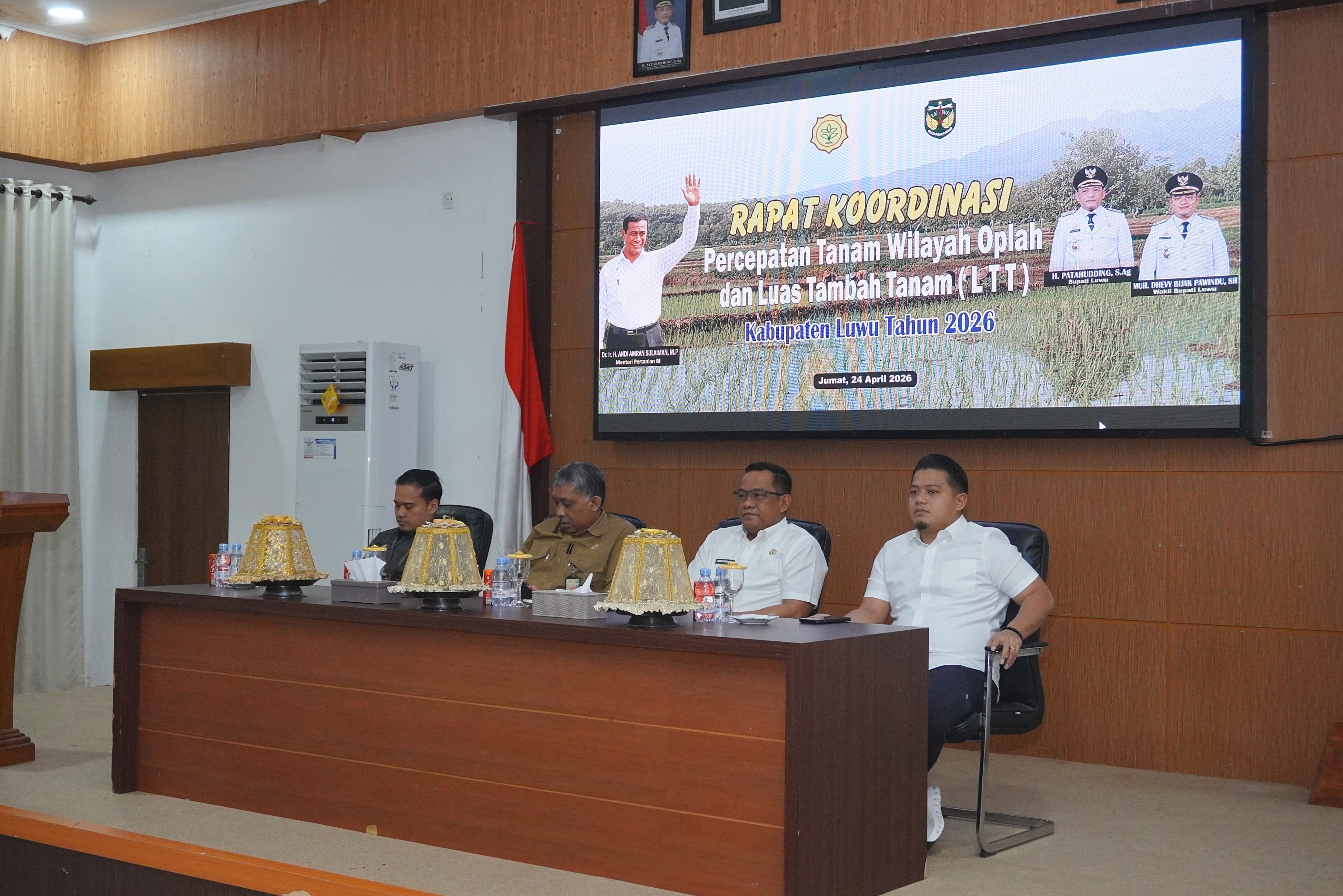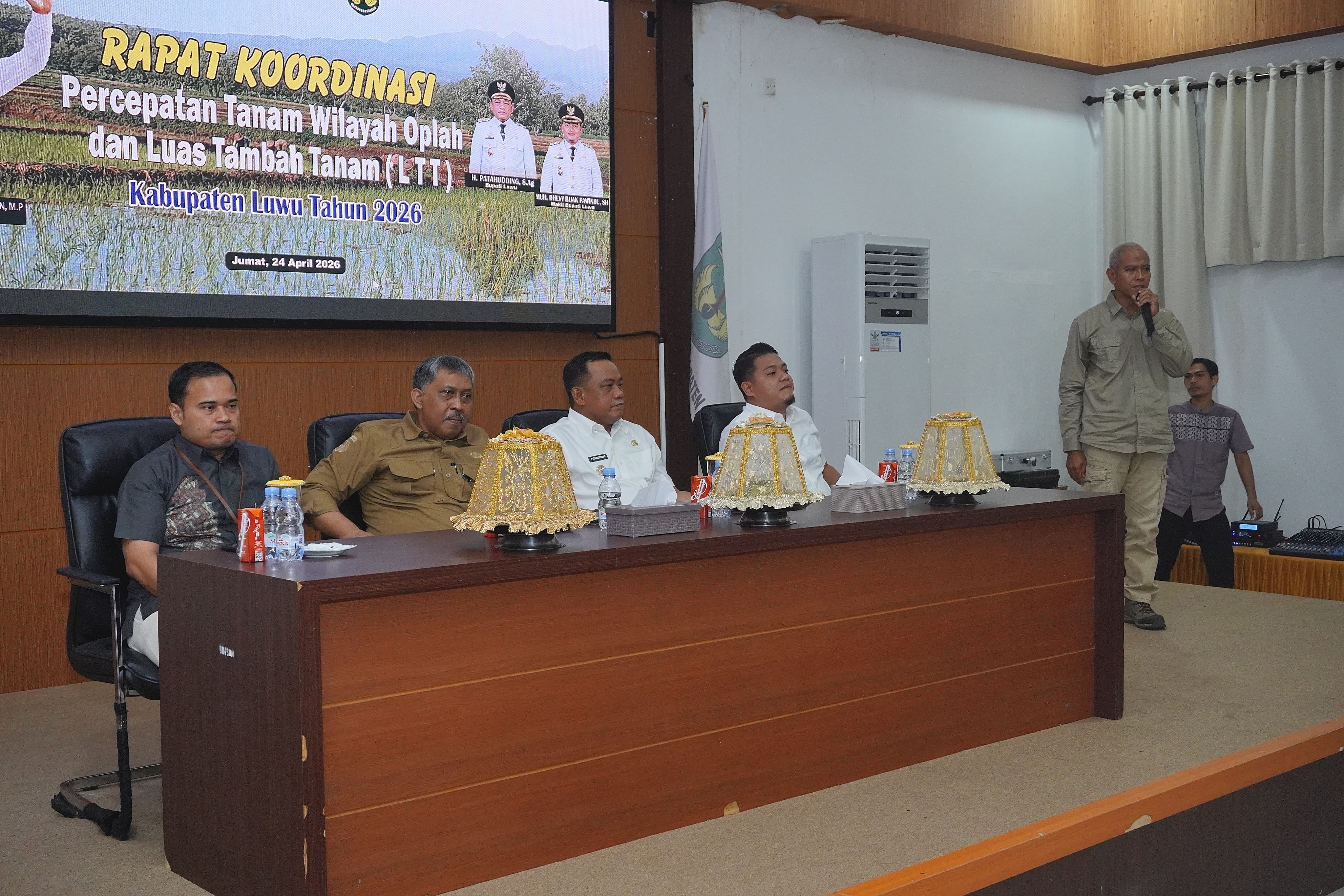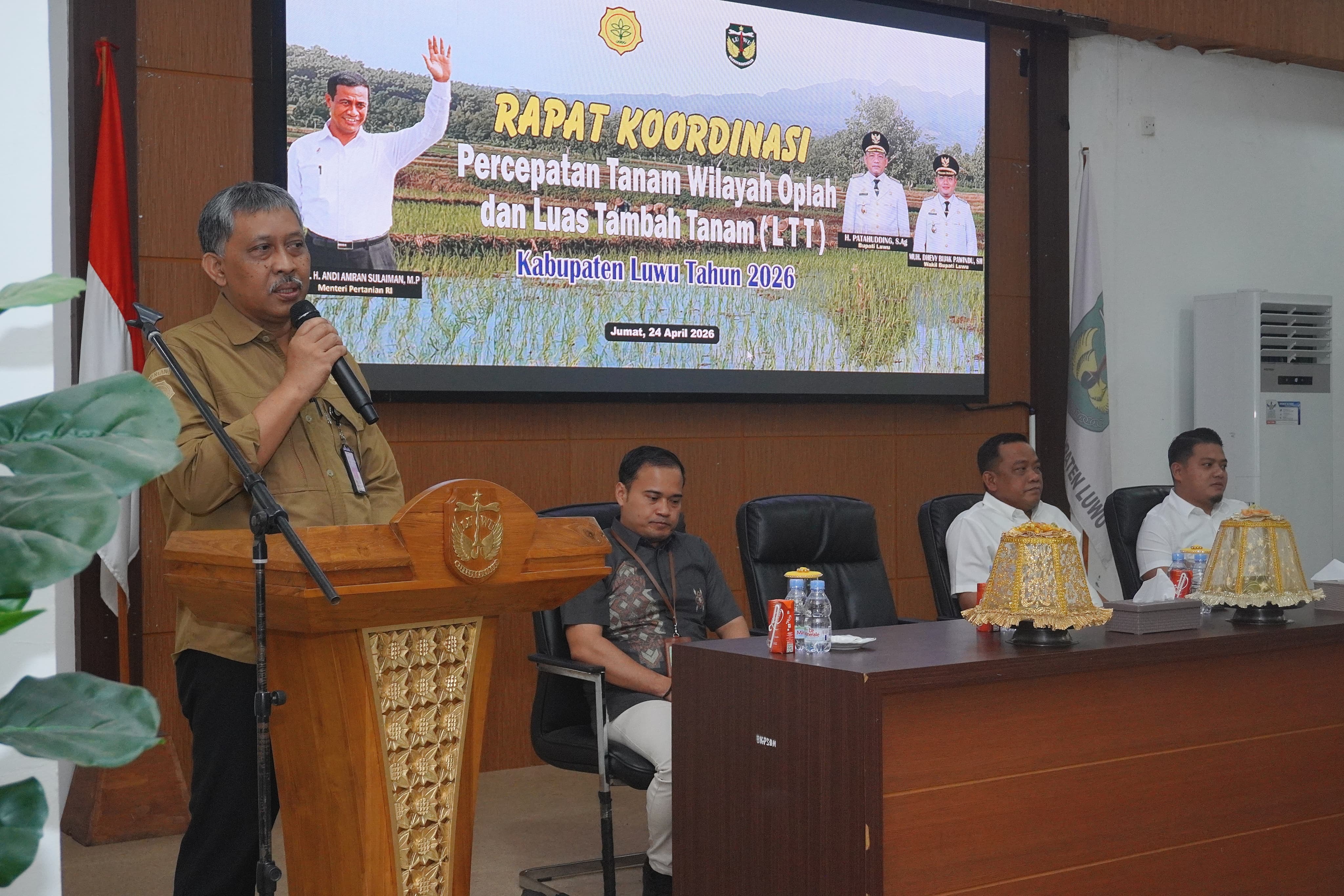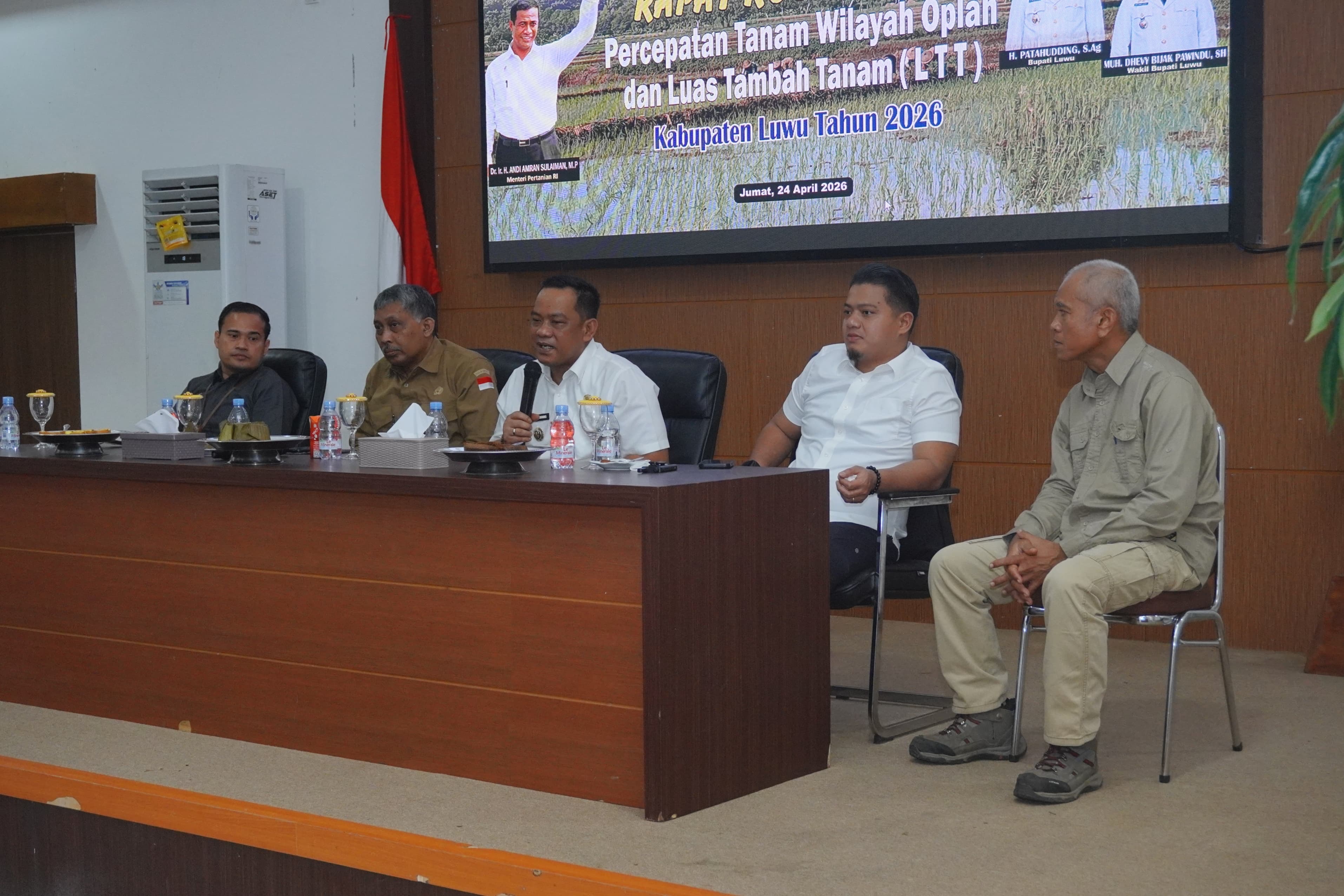 Bupati Luwu, Patahudding, menekankan pentingnya penguatan peran penyuluh saat Rapat Koordinasi Percepatan Tanam Wilayah Optimalisasi Lahan (Oplah) dan Luas Tambah Tanam (LTT) di Aula Rumah Jabatan Bupati Luwu, Jumat (24/4/2026).