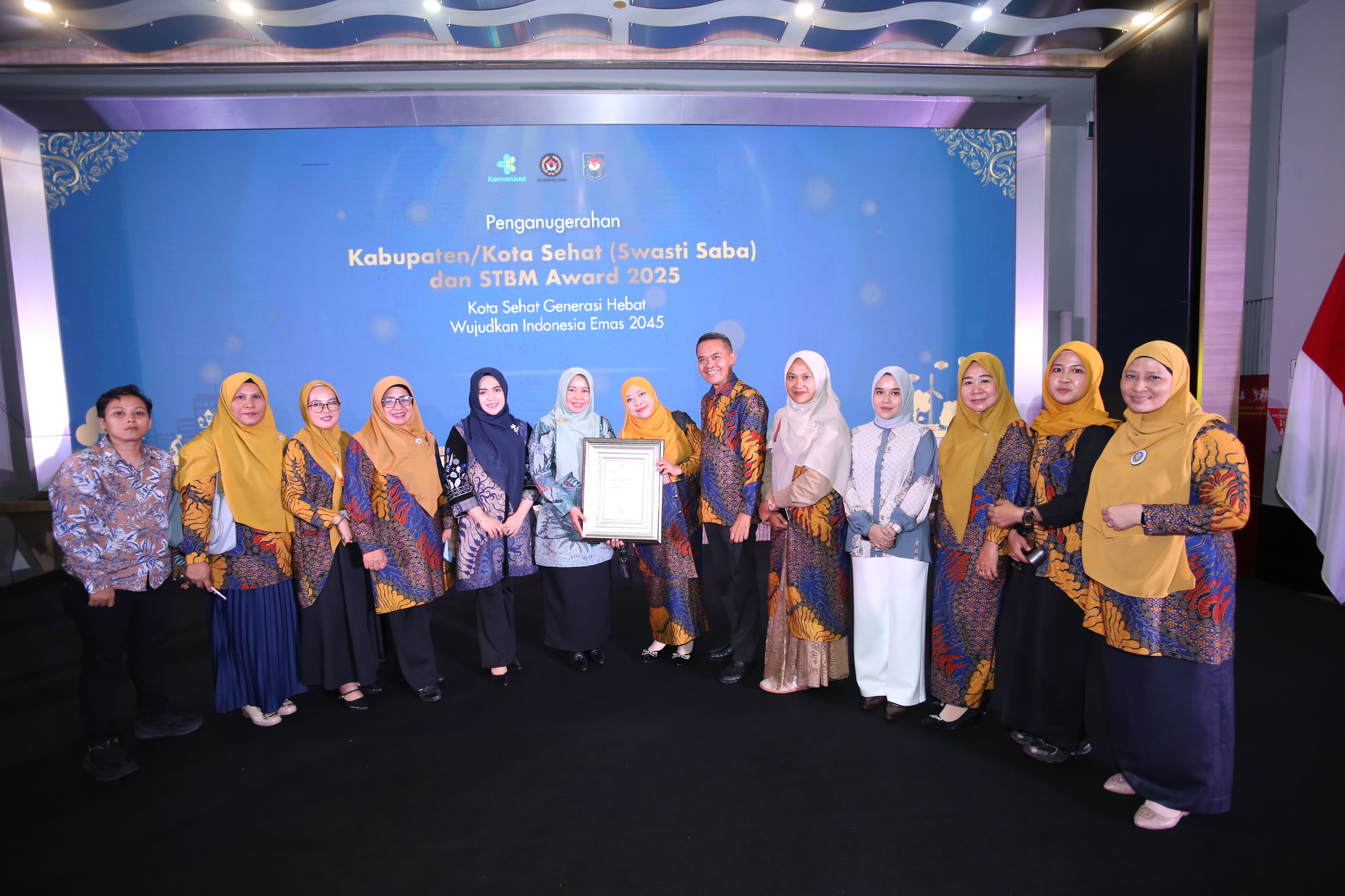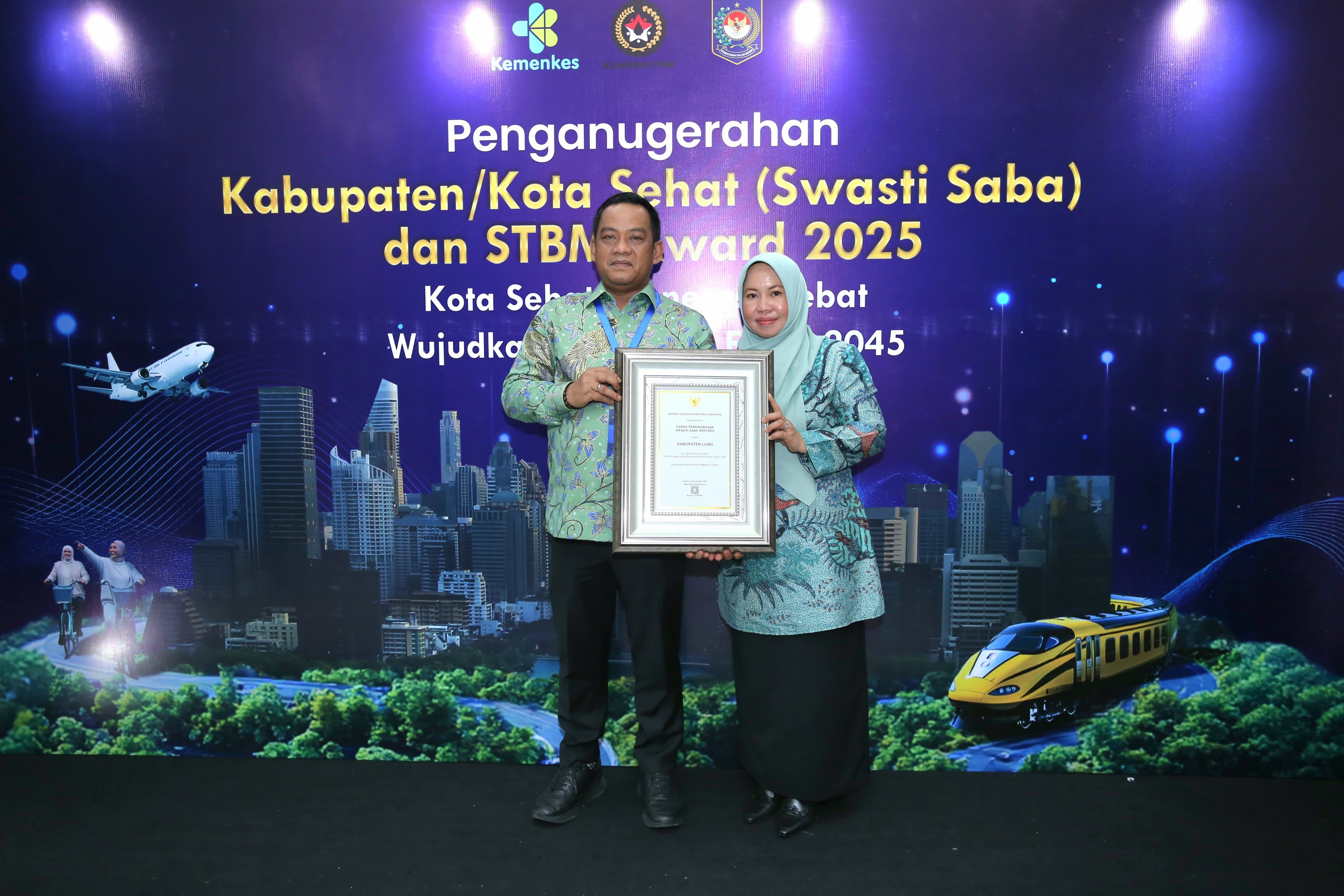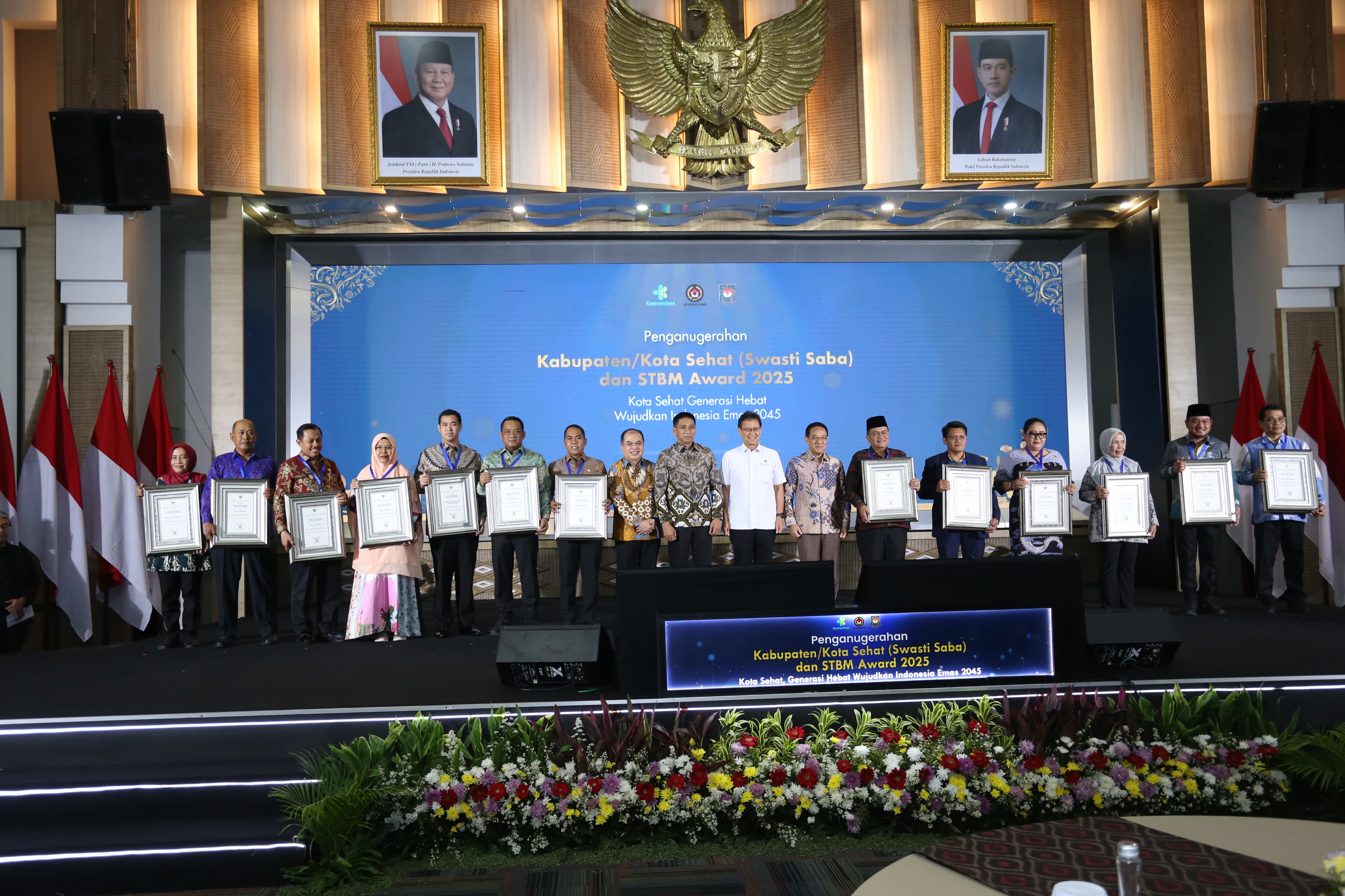 Bupati Luwu, Patahudding, menerima penghargaan Swasti Saba Wistara dari Kementerian Kesehatan pada acara Penganugerahan Kabupaten/Kota Sehat dan STBM Tahun 2025 yang berlangsung di Auditorium Siwabessy, Kementerian Kesehatan, Jakarta Selatan, Jumat (28/11/2025). Penghargaan diserahkan langsung oleh Menteri Kesehatan, Budi G. Sadikin.