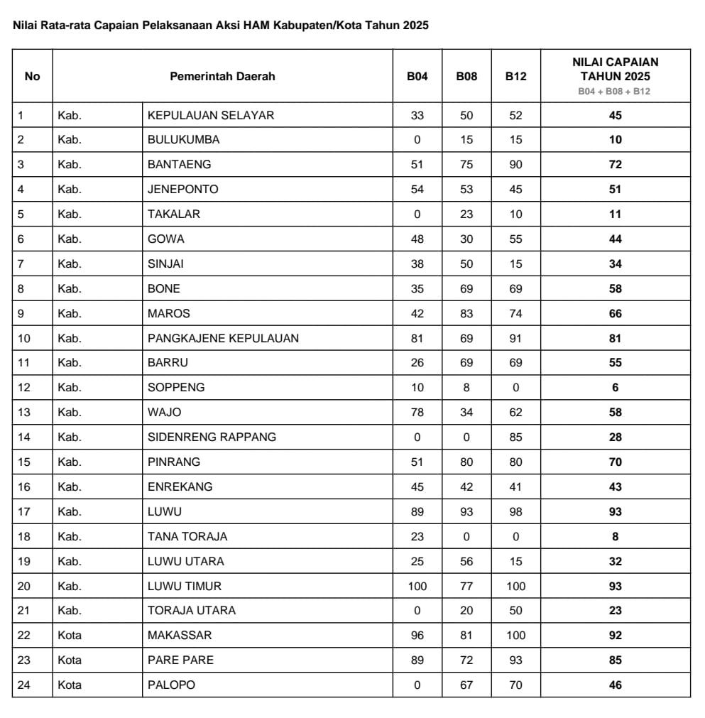 “Berdasarkan hasil verifikasi tersebut, PANRANHAM menyampaikan hasil capaian Aksi HAM periode B-04, B-08, dan B-12 Tahun 2025 kepada Kepala Kantor Wilayah Kementerian Hak Asasi Manusia. Dalam surat resmi hasil capaian Aksi HAM tersebut, disebutkan bahwa Kabupaten Luwu dan Kabupaten Luwu Timur menjadi daerah dengan nilai tertinggi, masing-masing memperoleh 93 poin, sebagai bentuk komitmen kuat pemerintah daerah dalam pemenuhan, perlindungan, dan penghormatan HAM”, ungkap Partisan.