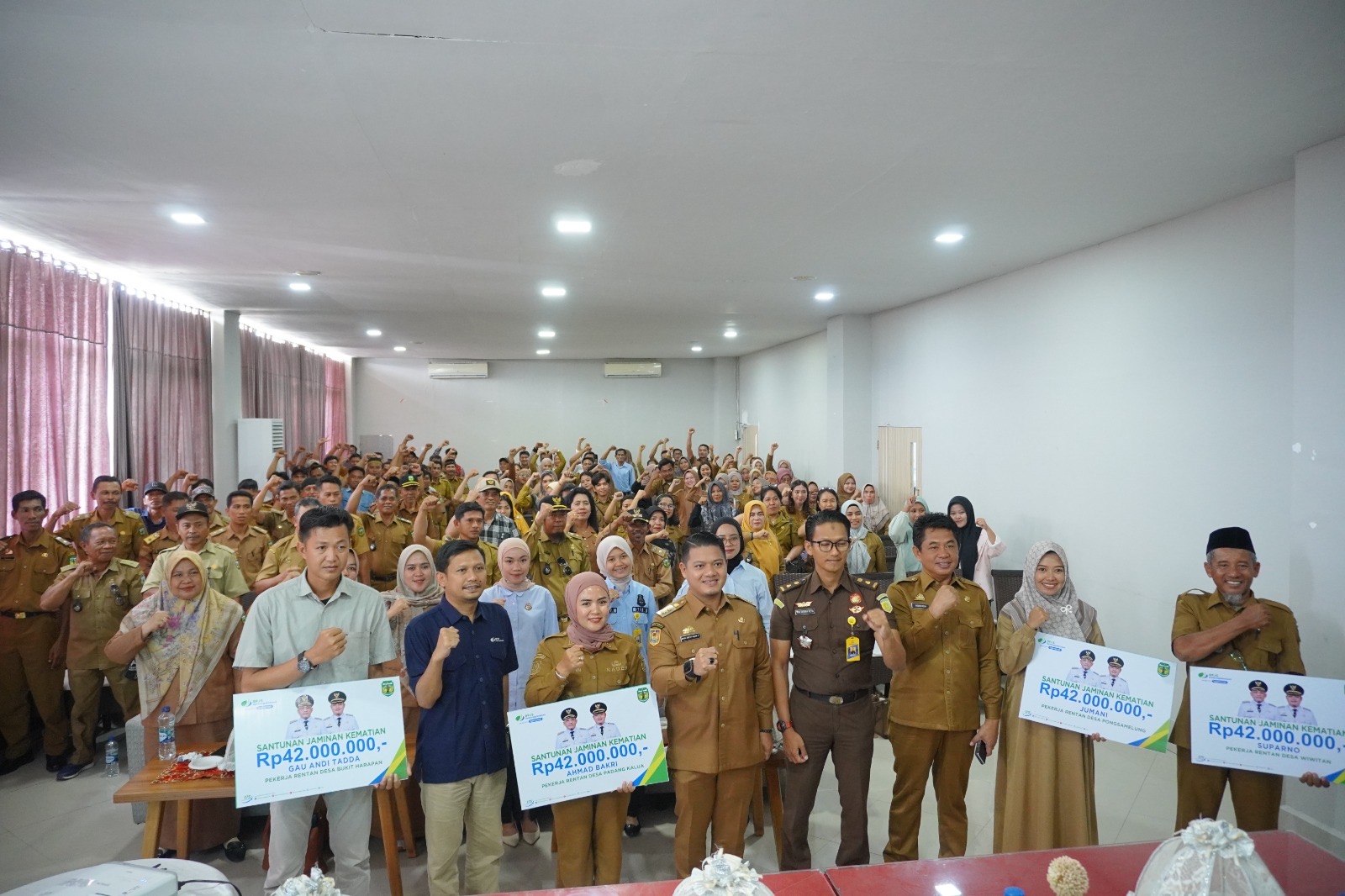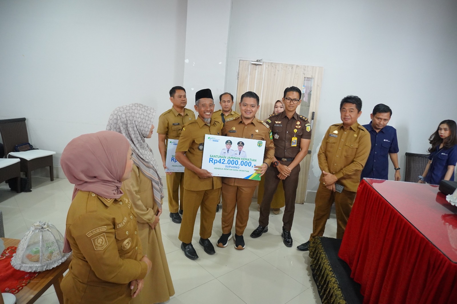 Pada kesempatan itu, Wakil Bupati Juga menyerahkan santunan kematian dan santunan kecelakaan kerja kepada ahli waris pekerja rentan dan aparat desa yang telah meninggal dunia.