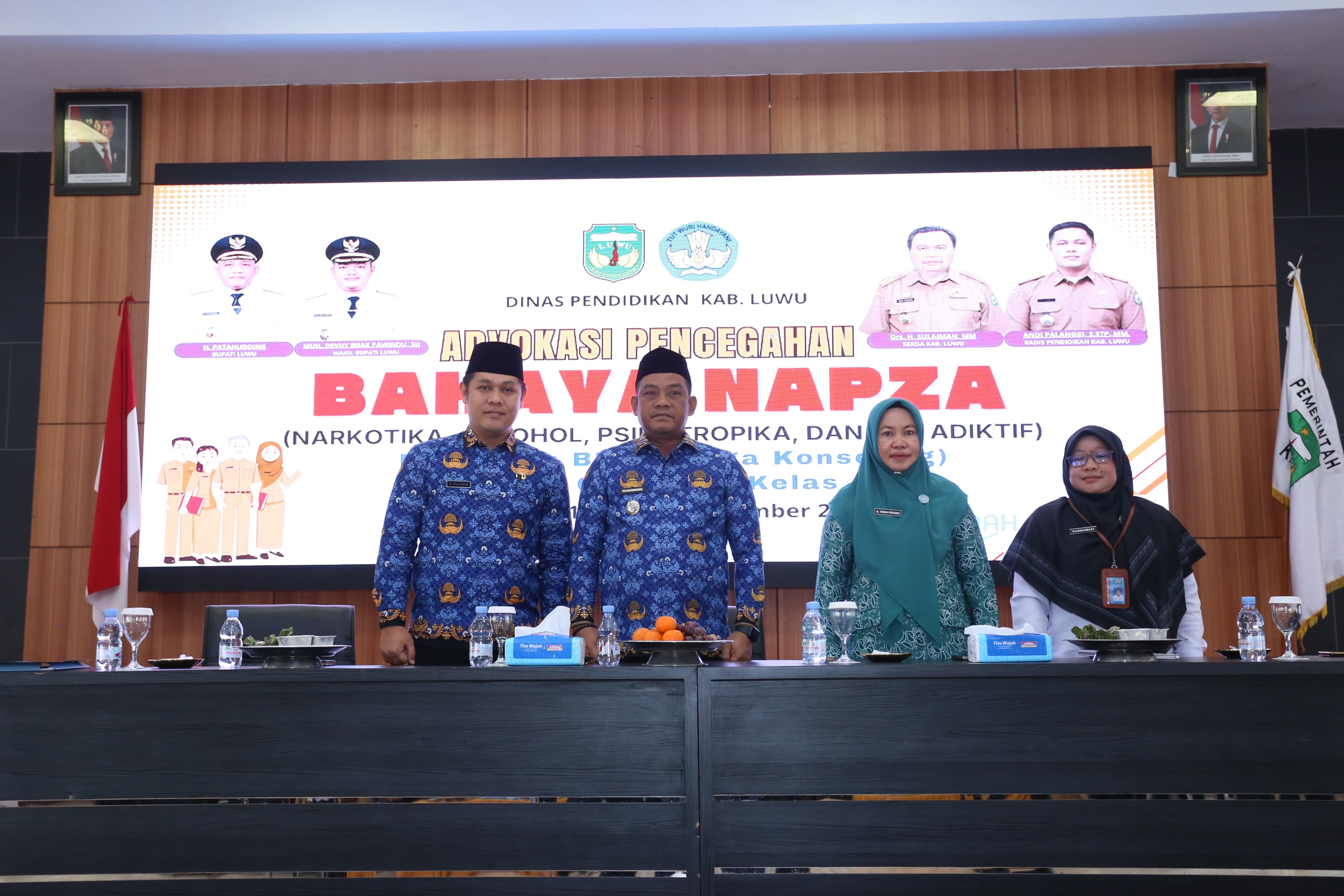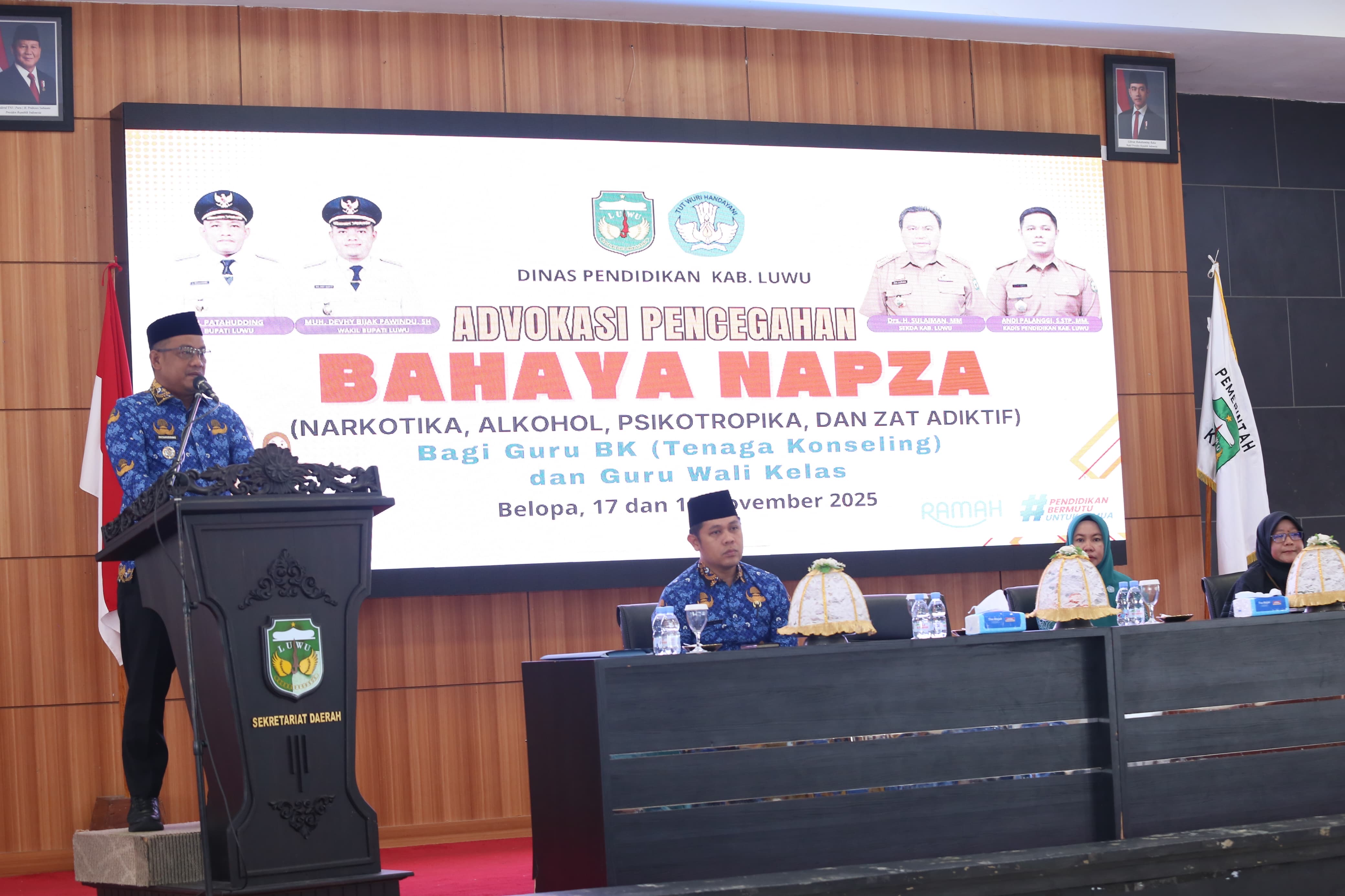 Pemerintah Kabupaten Luwu melalui Dinas Pendidikan menyelenggarakan kegiatan advokasi pencegahan bahaya Narkotika, Psikotropika, dan Zat Adiktif lainnya (NAPZA) bagi guru bimbingan dan konseling serta guru wali kelas se-Kabupaten Luwu di Ruang Pola Andi Kambo Kantor Bupati Luwu, Senin (17/11/2025).