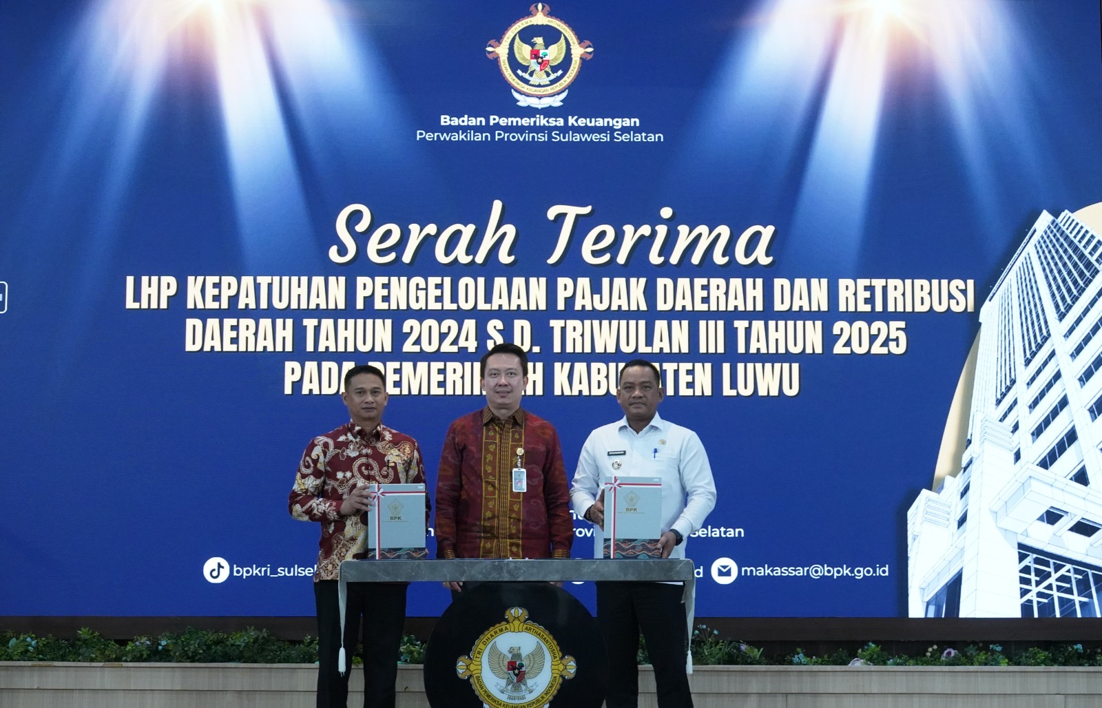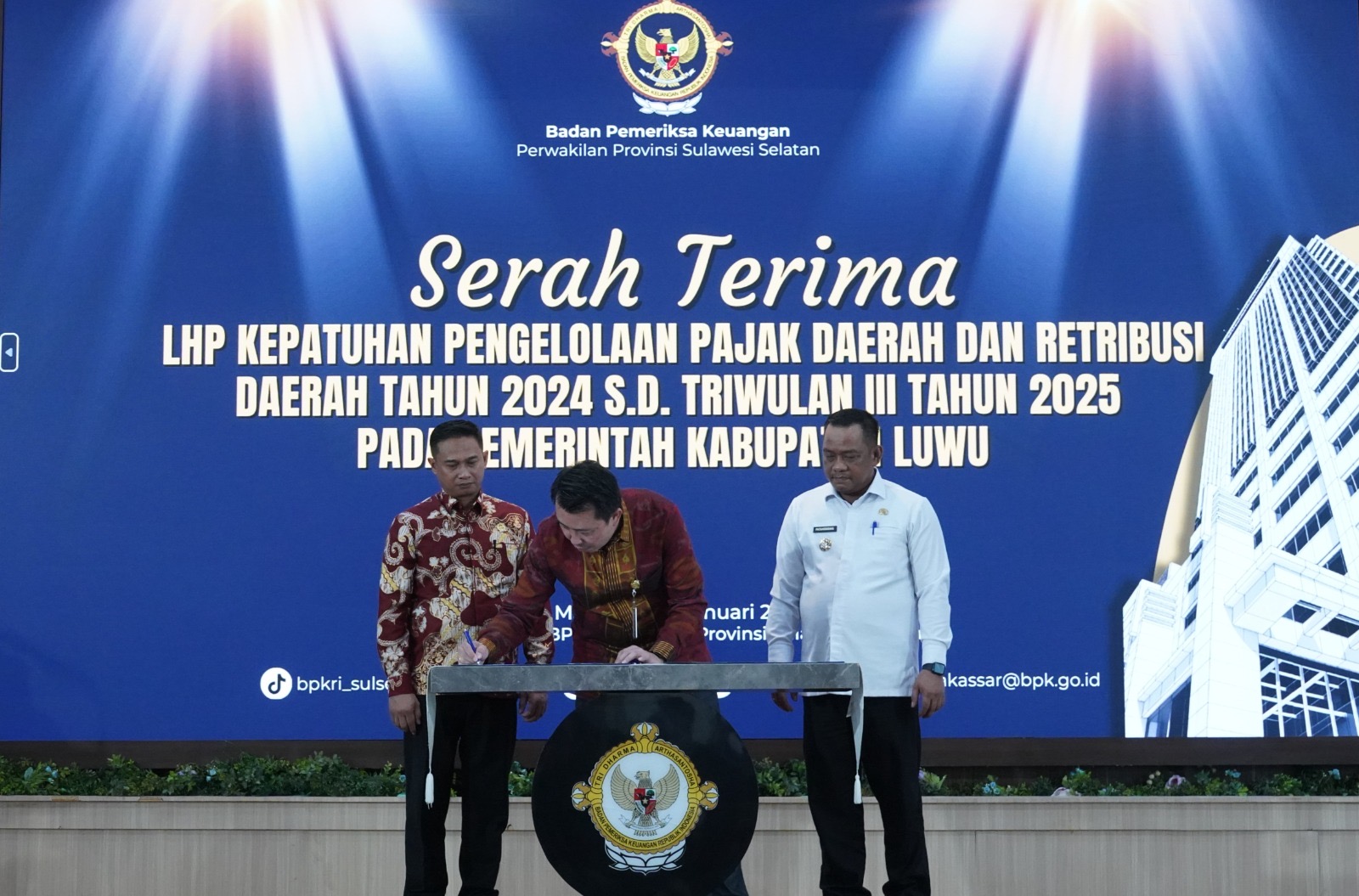 Penyerahan LHP tersebut berlangsung di Ruang Auditorium Lantai II Kantor BPK RI Perwakilan Provinsi Sulawesi Selatan, Jalan AP Pettarani, Makassar, Kamis (15/1/2026). LHP diterima langsung oleh Bupati Luwu, Patahudding, dari Kepala BPK RI Perwakilan Provinsi Sulawesi Selatan, Winner Franky Halomoan Manalu, disertai penandatanganan Berita Acara Serah Terima bersama Ketua DPRD Kabupaten Luwu, Ahmad Gazali.
