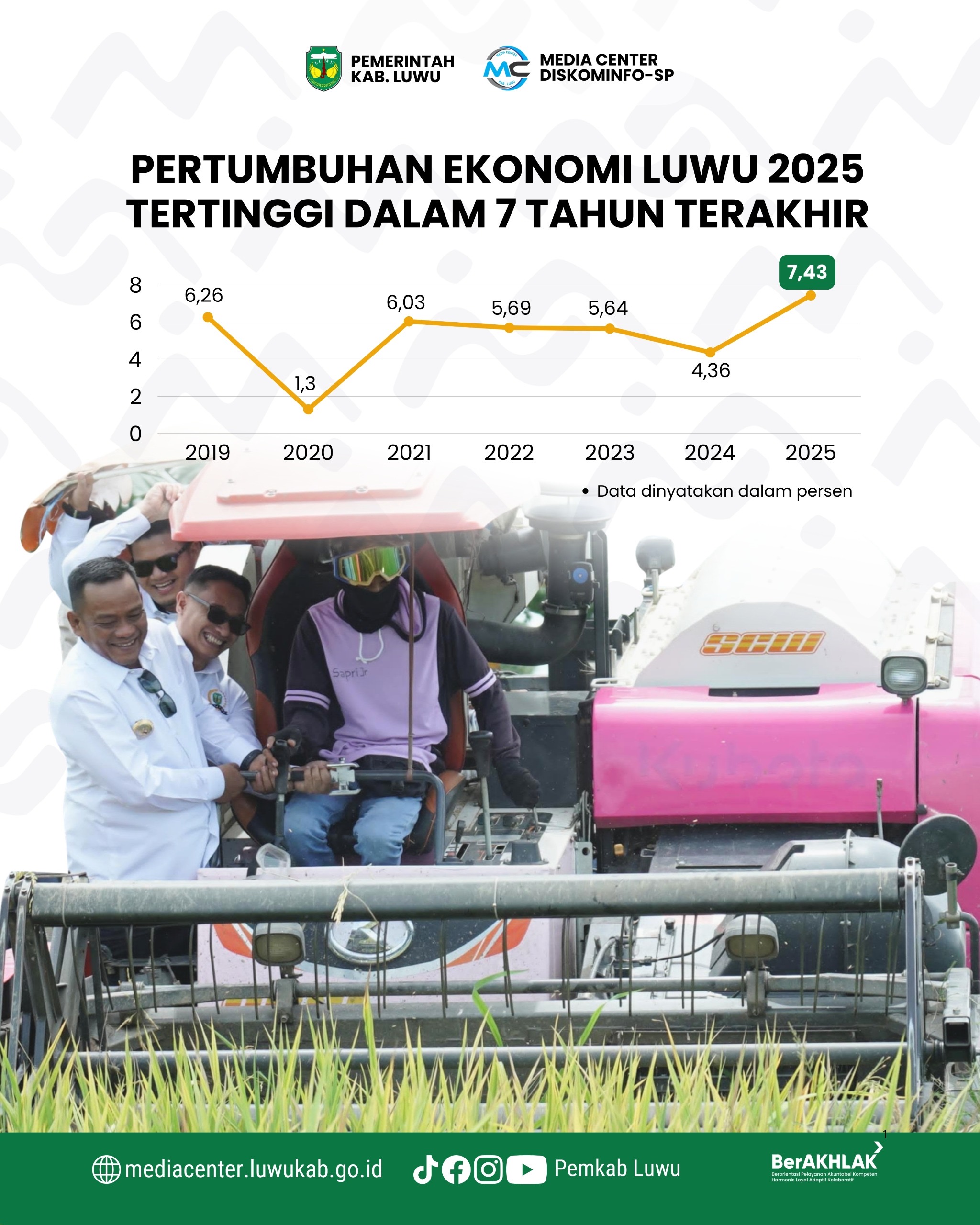 Pertumbuhan ekonomi Kabupaten Luwu tahun 2025 mencapai 7,43 persen berdasarkan data Badan Pusat Statistik (BPS) Kabupaten Luwu. Capaian ini menjadi yang tertinggi dalam tujuh tahun terakhir sekaligus menandai momentum pemulihan ekonomi daerah.