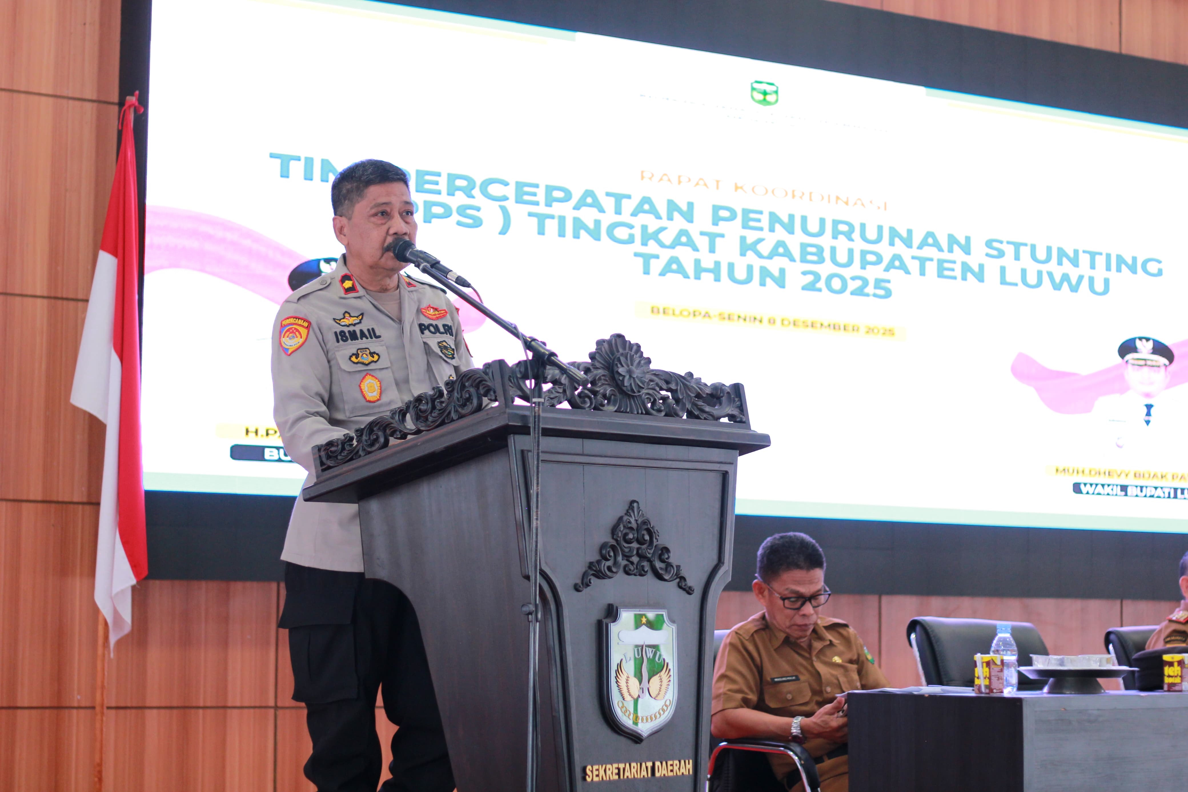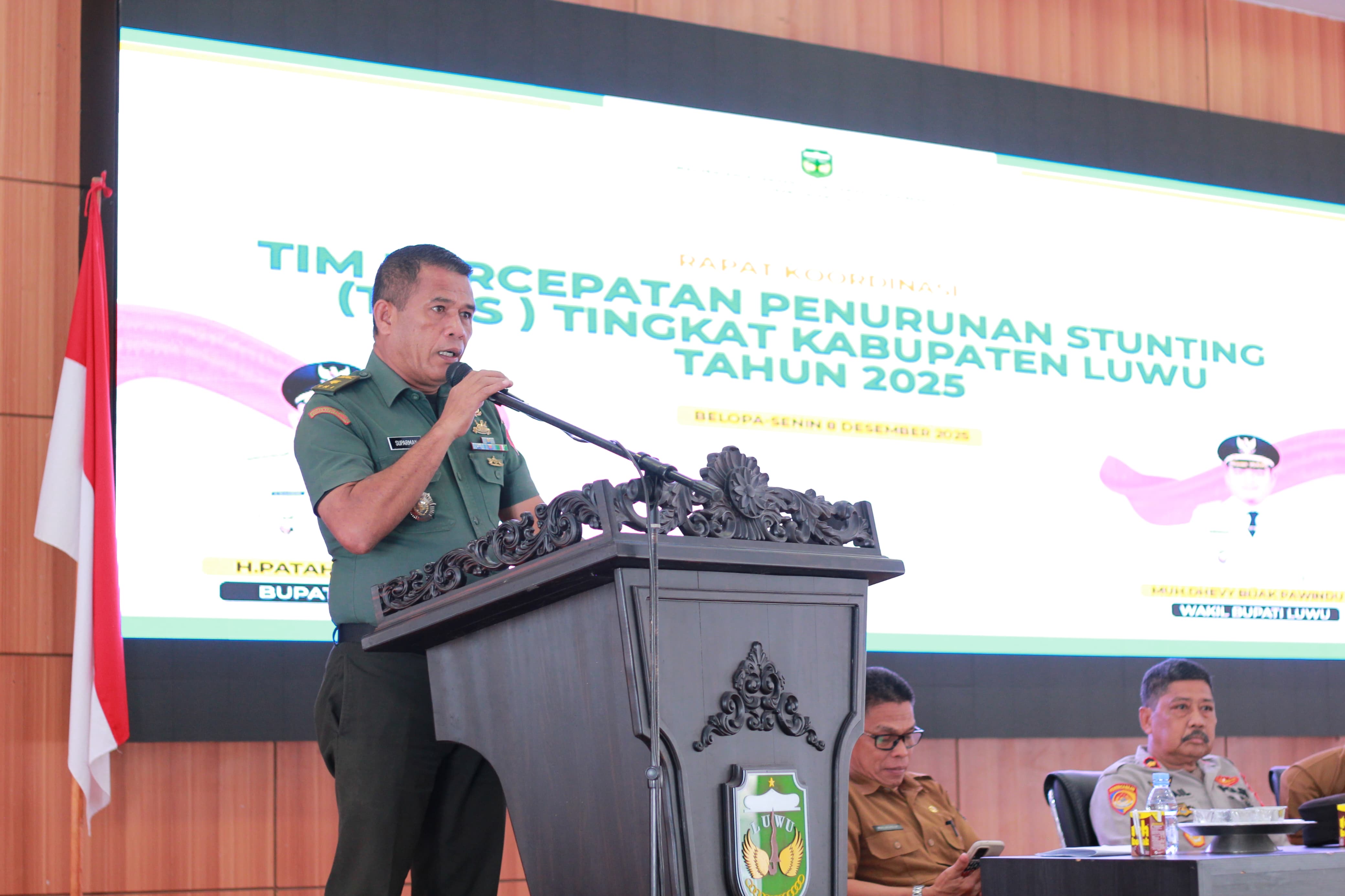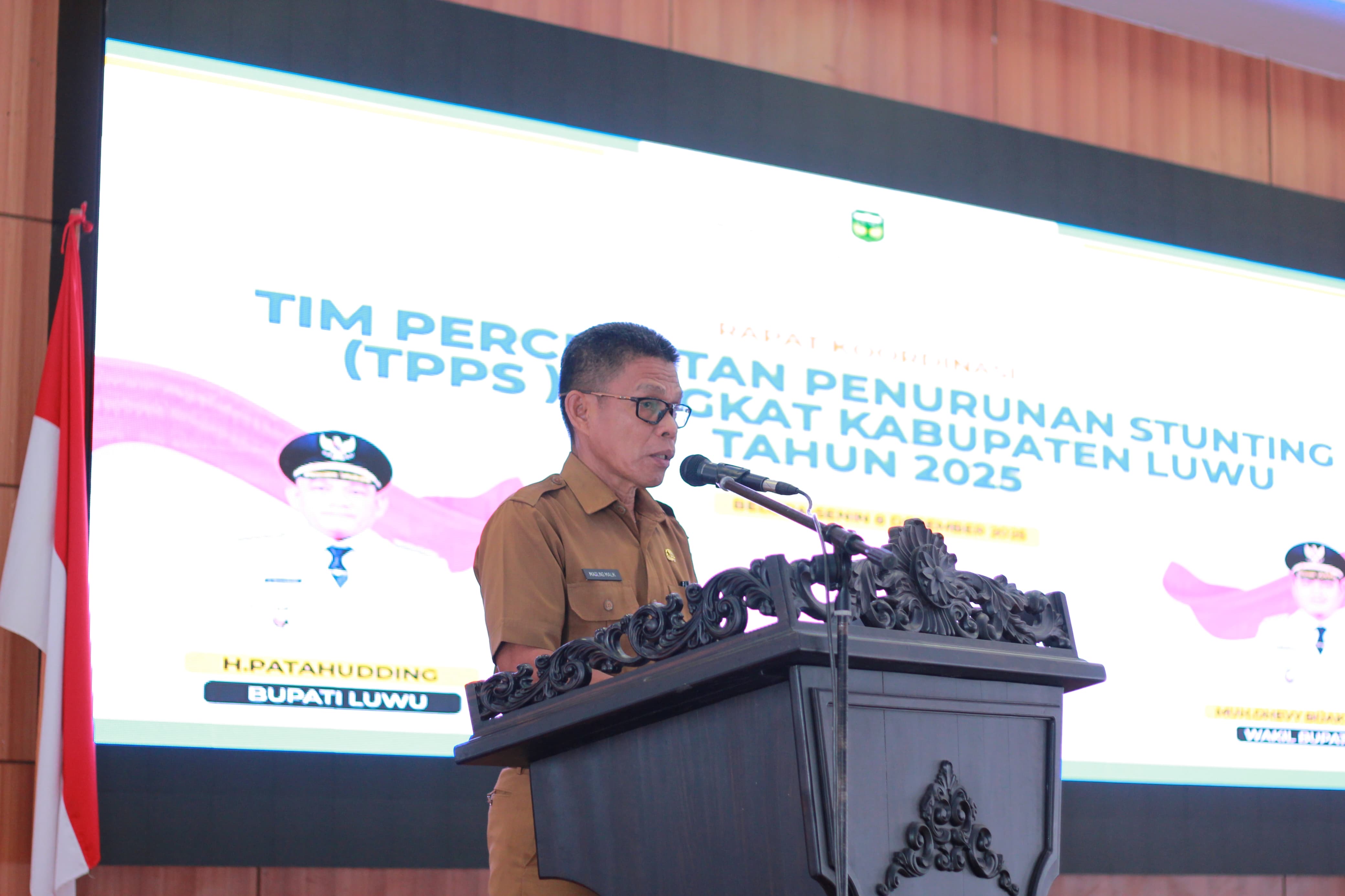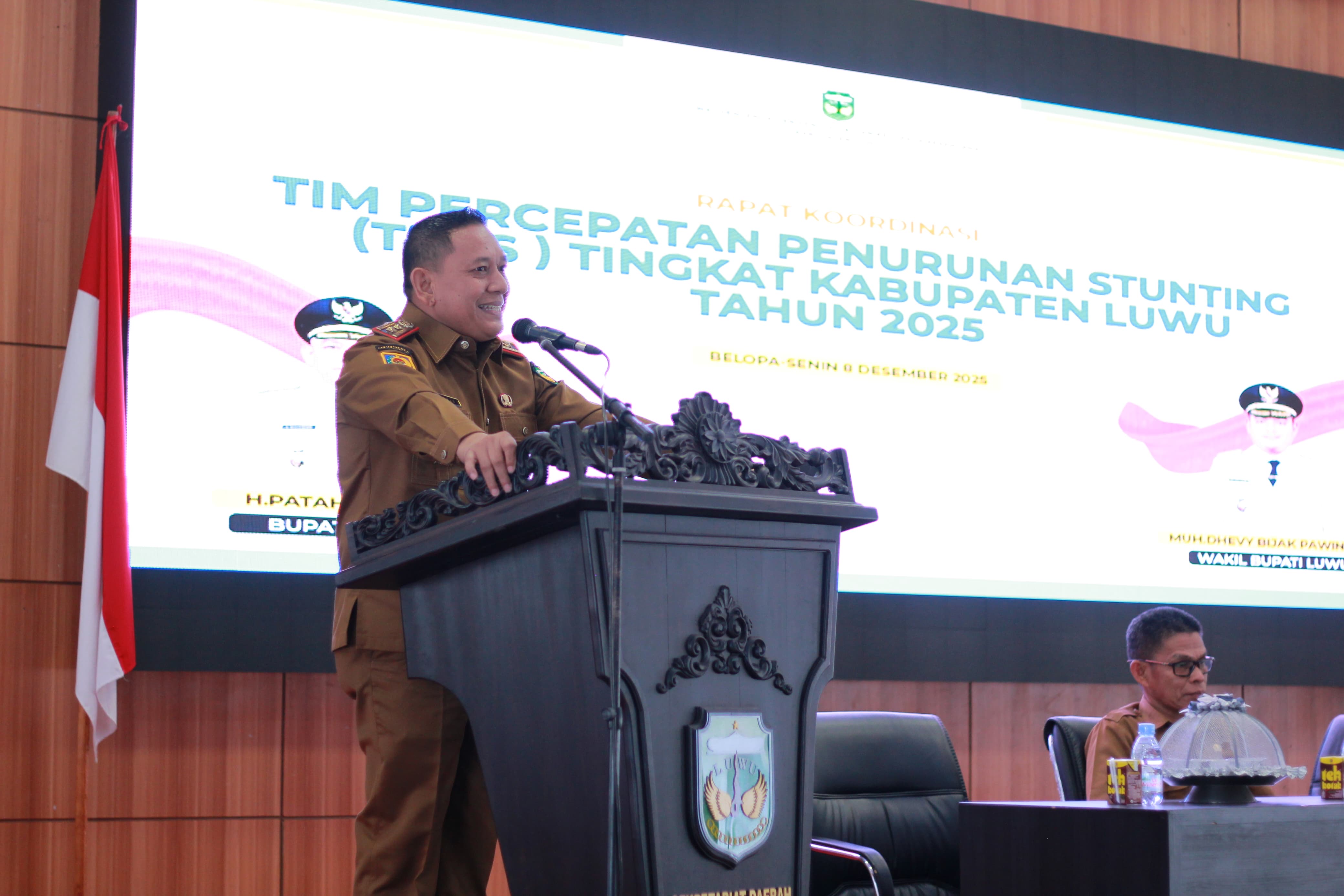 Pemerintah Kabupaten Luwu menggelar Rapat Koordinasi Tim Percepatan Penurunan Stunting (TPPS) Kabupaten Luwu di Ruang Pola Andi Kambo, Kantor Bupati Luwu, Senin (8/12/2025). Kegiatan ini dihadiri 242 peserta yang terdiri atas perangkat daerah terkait, Tim Penggerak PKK, camat, kepala desa/lurah, kepala puskesmas, serta penyuluh KB.